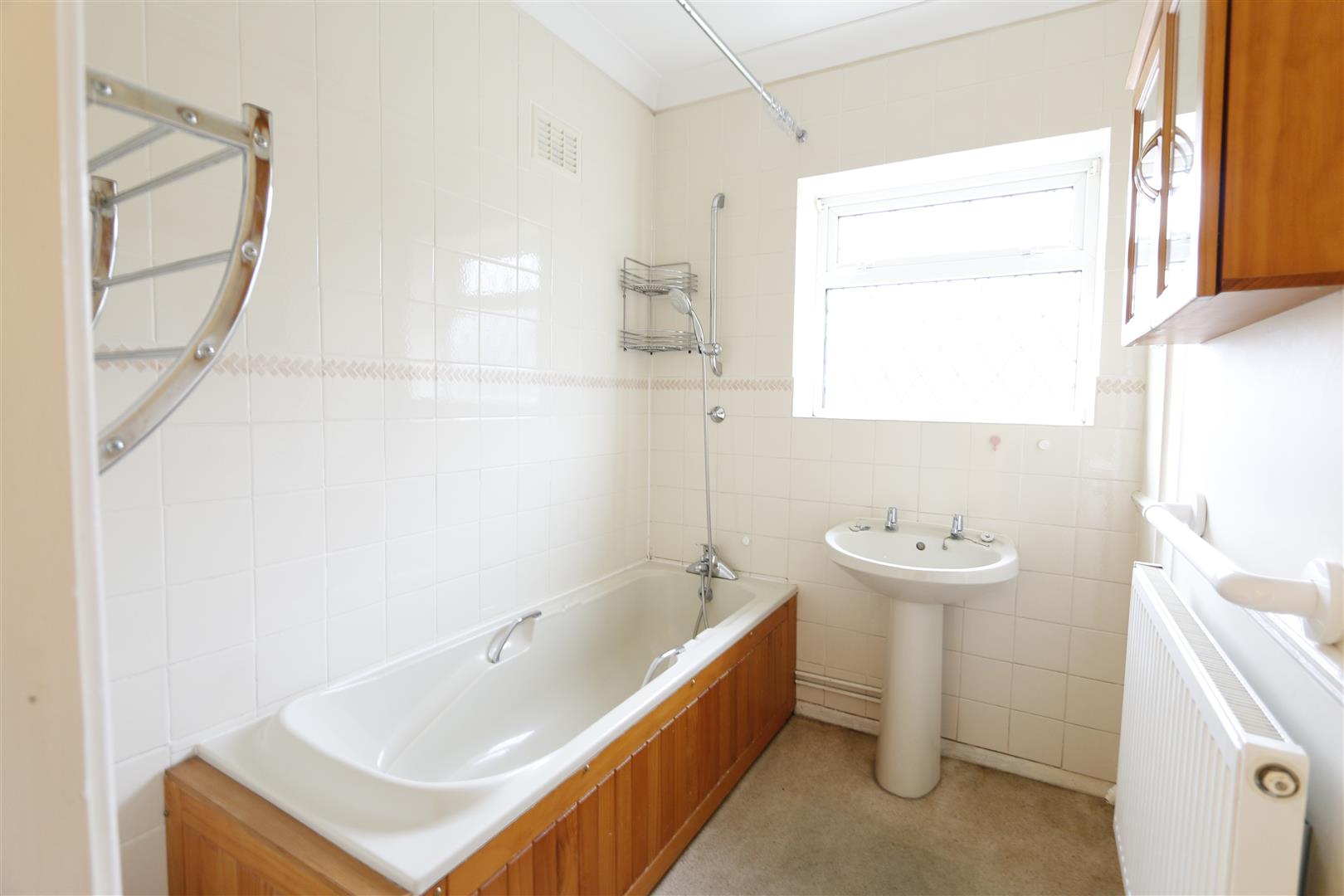 Suite comprising of panel enclosed bath, pedestal wash hand basin, radiator, part tiled walls, coving, uPVC double glazed window to side.