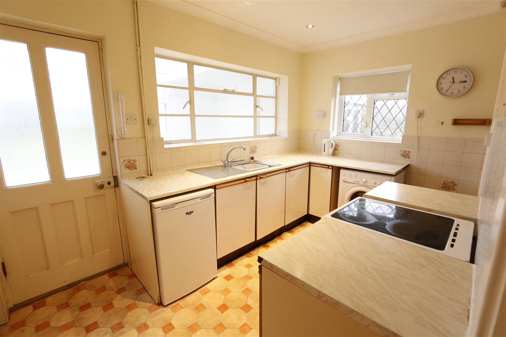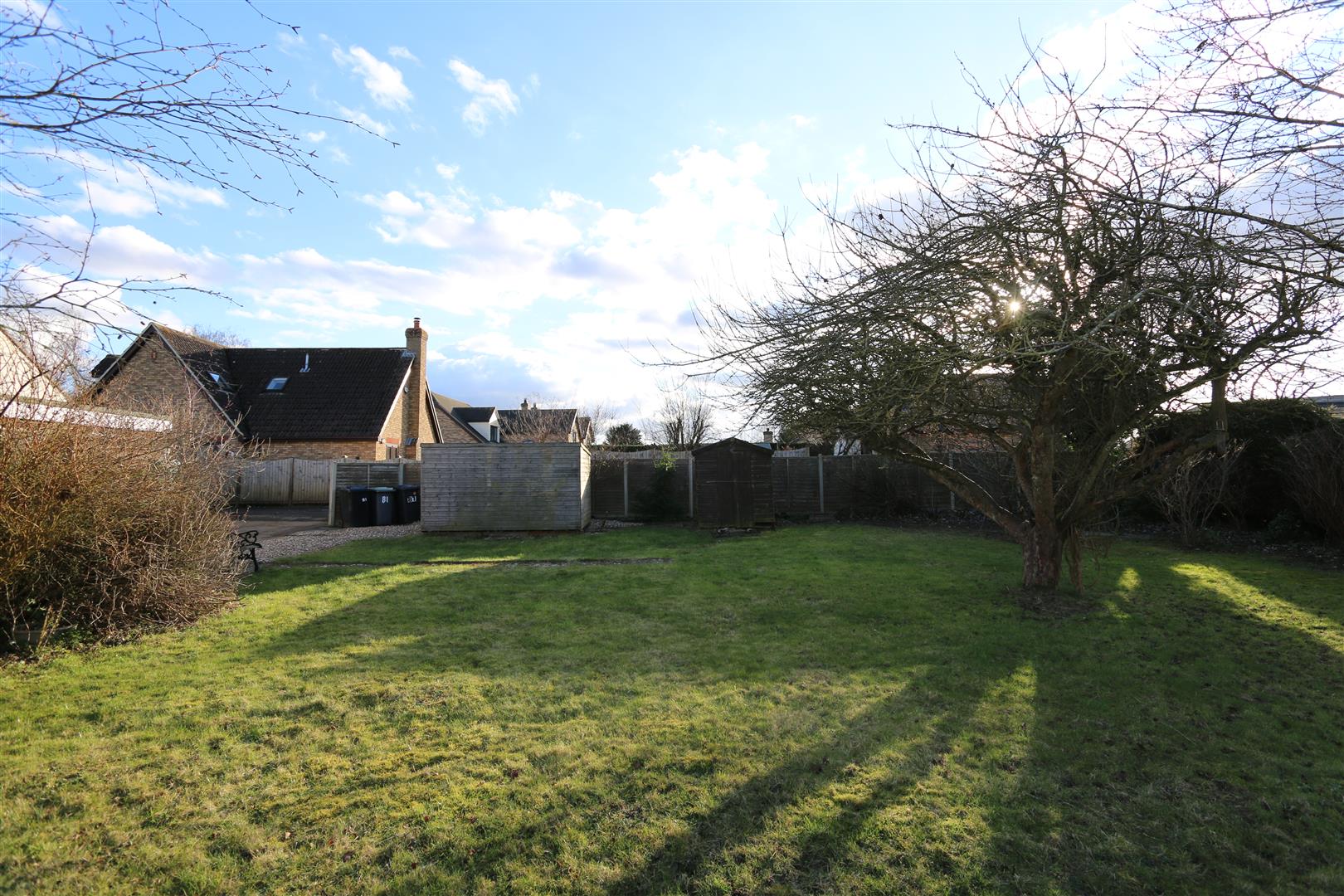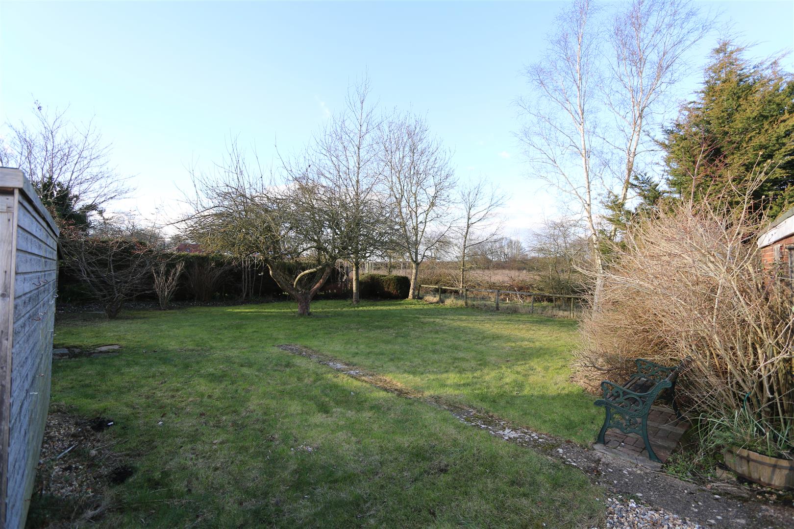 Large rear garden, laid mainly to lawn with mature hedging and trees, large gravelled area, path leading to garden shed, vehicular access leading to garage and further parking.