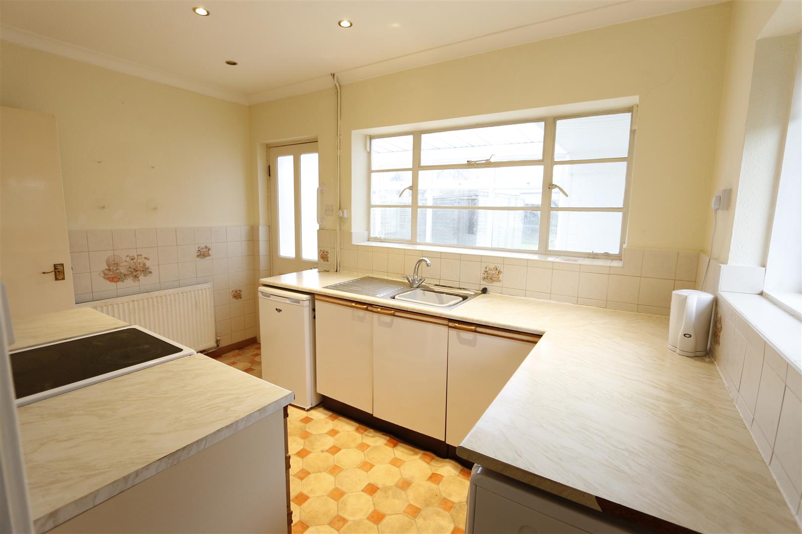 Range of base and eye level units with roll top work surfaces, stainless steel sink unit, radiator, large walk in larder, inset spotlights, coving, door to:-