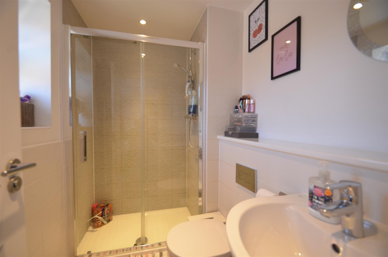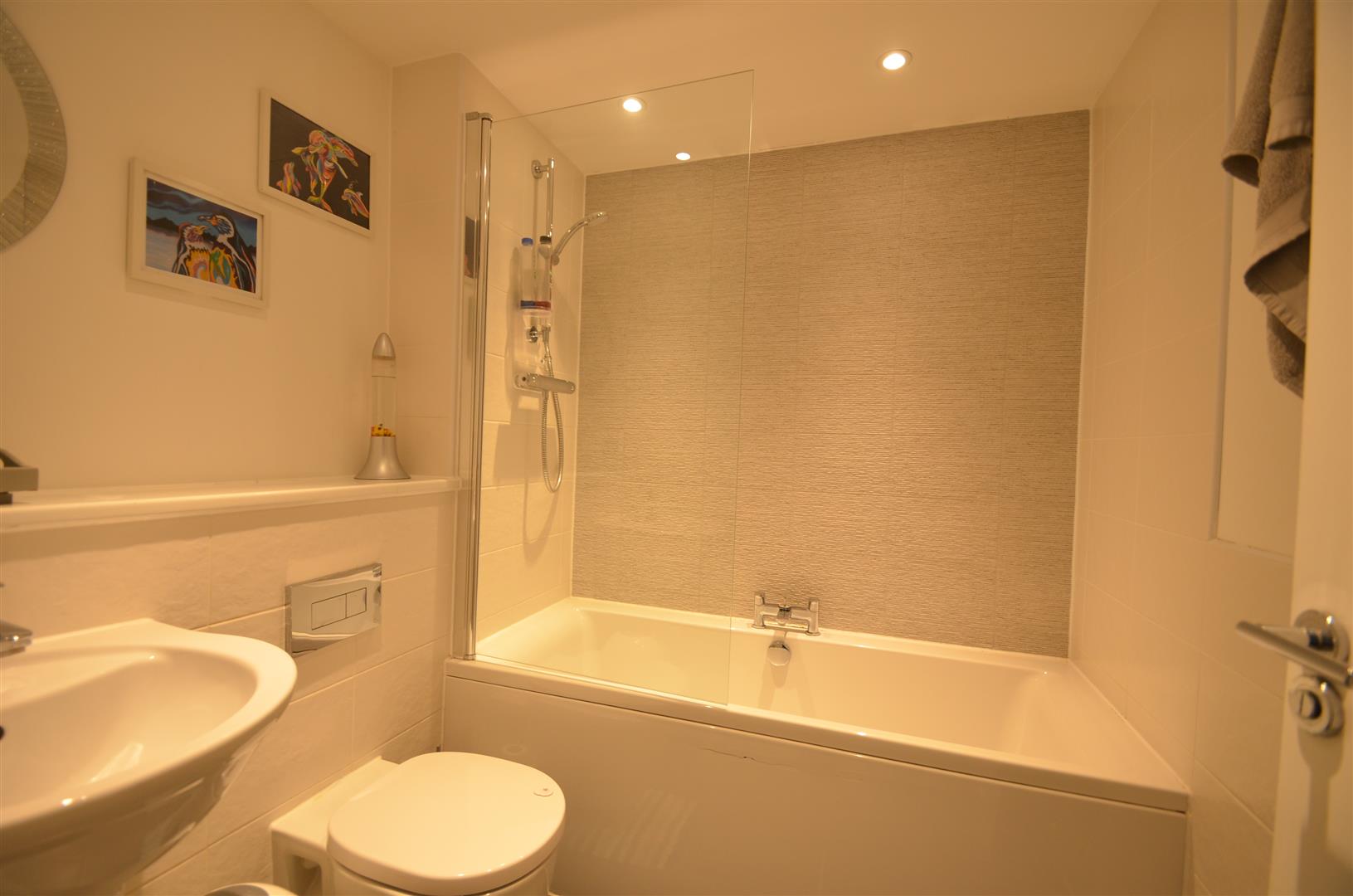White suite comprising of panel enclosed bath with mixer tap, wall mounted shower, glass shower screen, low level w.c, wash hand basin, tiled floor, part tiled walls, extractor fan, heated towel rail.