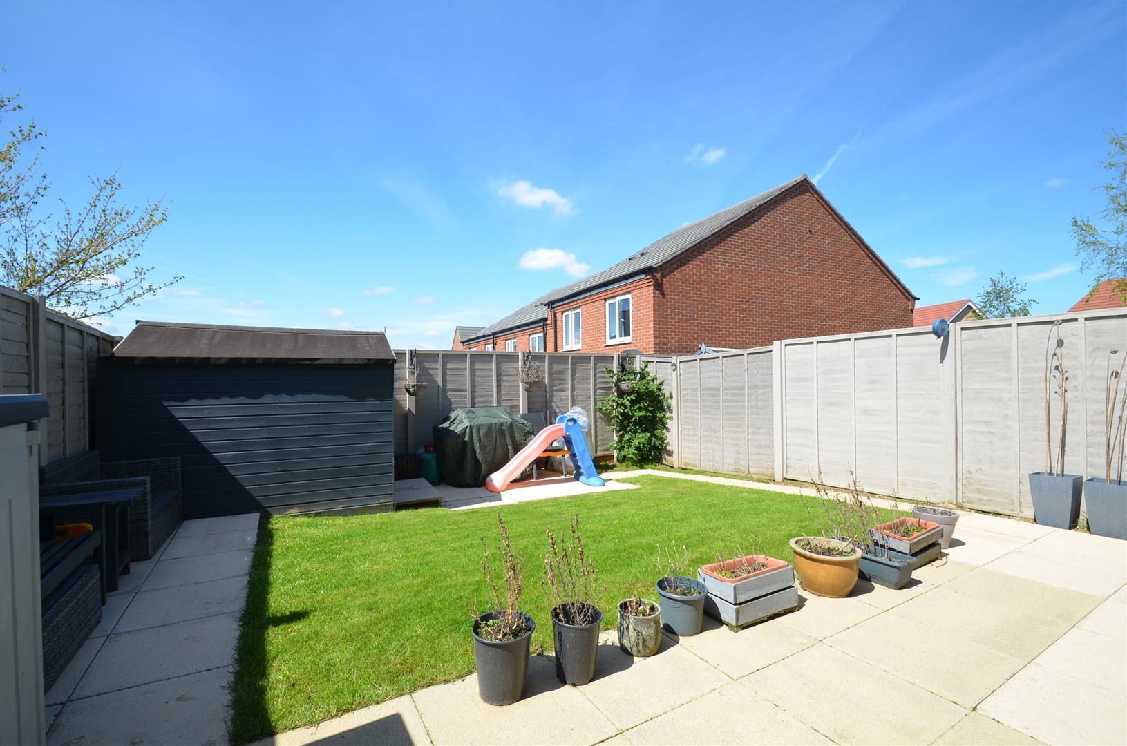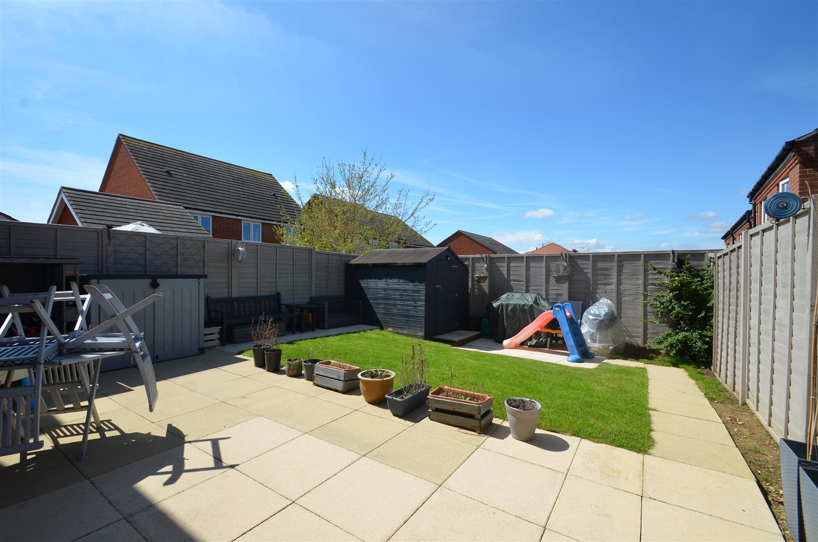 A fully enclosed garden with paved patio area and path leading to garden shed, rest laid mainly to lawn with gated access to front.