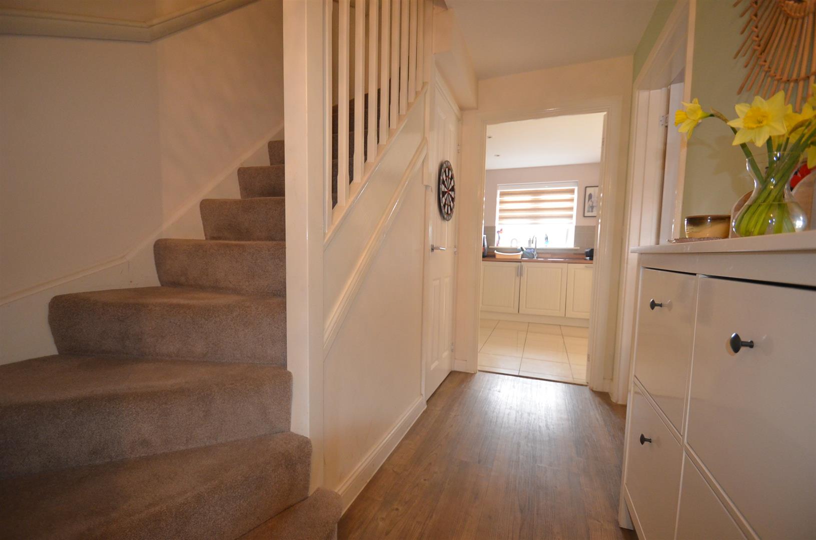 Entrance door, stairs leading to first floor, radiator, under stairs cupboard, wood effect flooring.