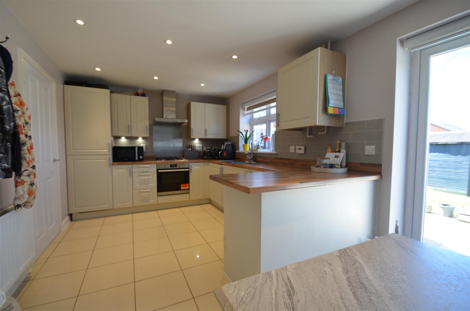 A well fitted kitchen with a range of base and eye level units with roll top work surfaces, one and a half stainless steel sink unit with mixer tap, tiled splashbacks, integrated fridge/freezer, dishwasher and washing machine, integrated oven with gas hob
