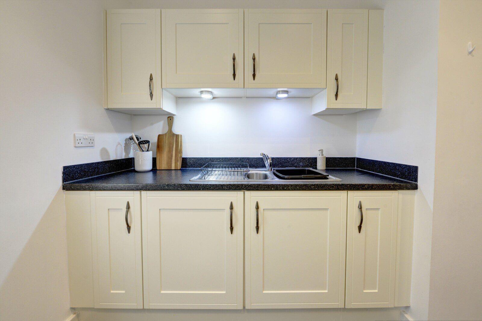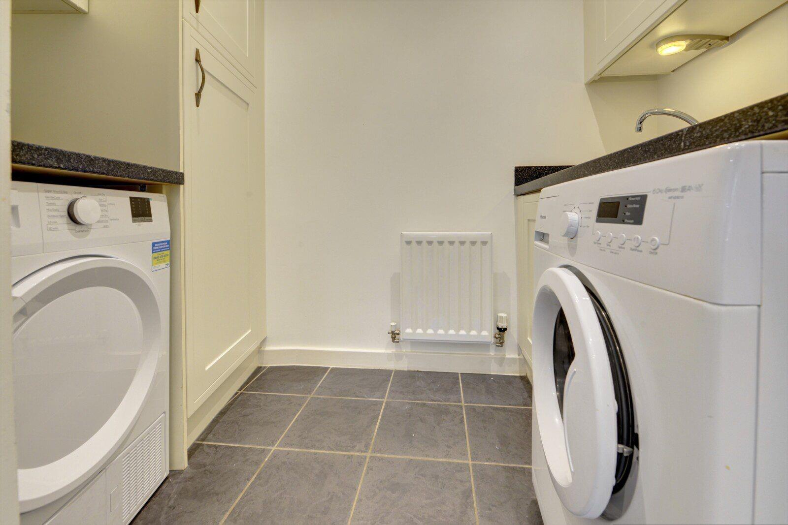 Range of wall and base units with work top work surface over, space for washing machine and dryer, ceramic flooring.