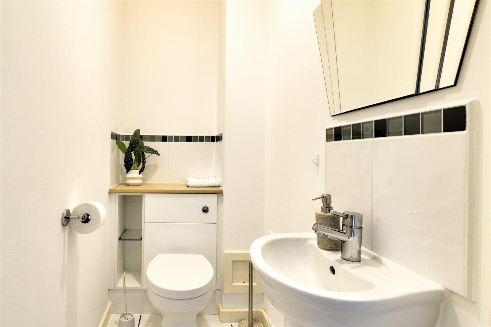 Modern suite with low level W.C and wash hand basin, ceramic flooring.