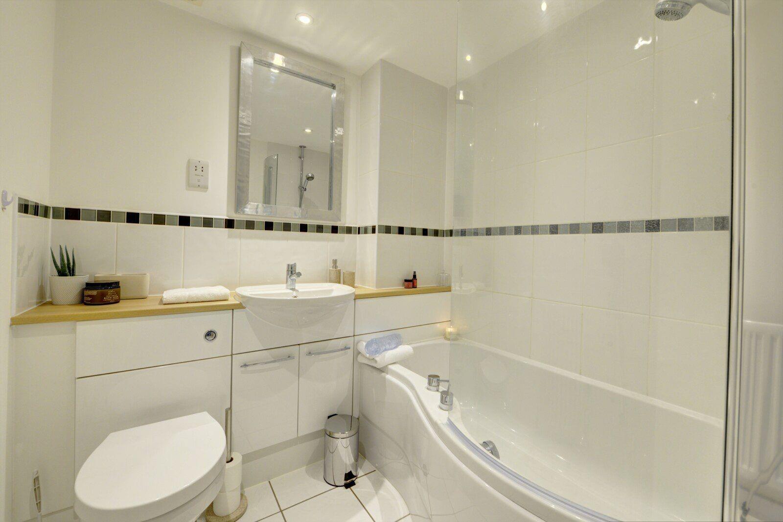 Full bathroom suite with curved bath and shower screen, wall mounted shower, vanity unit with wash hand basin and low level W.C, wall and floor tiles, radiator.