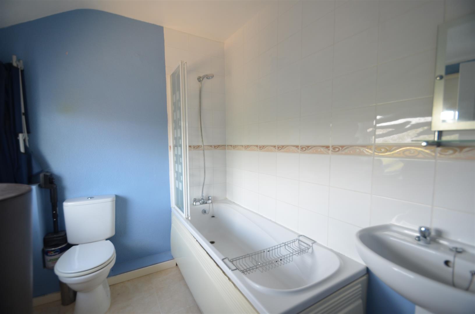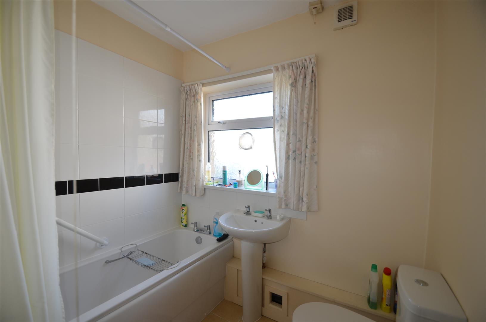 White suite comprising of panel enclosed bath with mixer tap and wall mounted shower attachment, glass shower screen, pedestal wash hand basin, low level w.c, part tiled walls, window to rear.