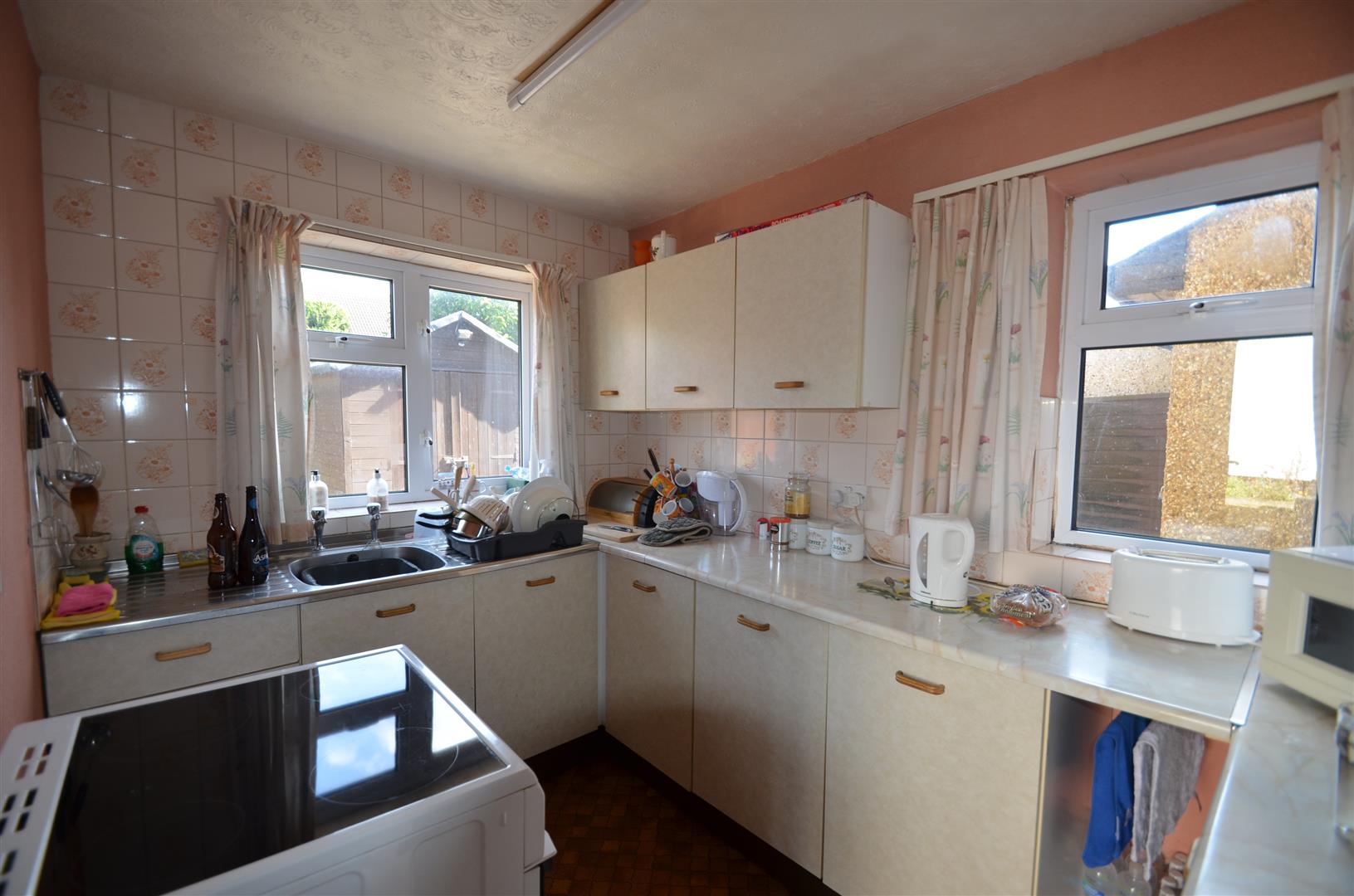 Range of base and eye level units with roll top work surfaces, stainless steel sink unit, tiled splash back, windows to rear and side.