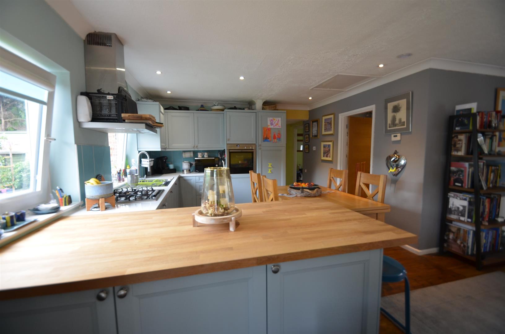 Range of base and eye level units with roll top work surfaces, one and a half stainless steel sink with mixer tap, gas hob with stainless steel chimney hood over, integrated eye level oven, integrated fridge, integrated dishwasher, tiled splash back, wood