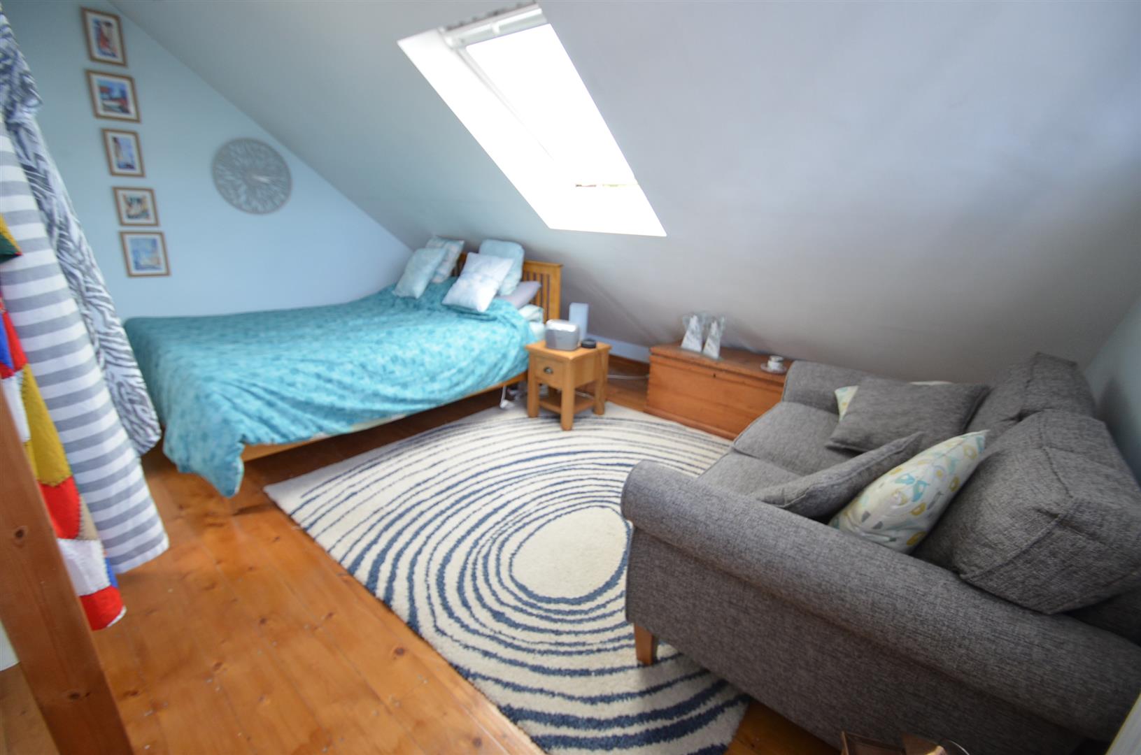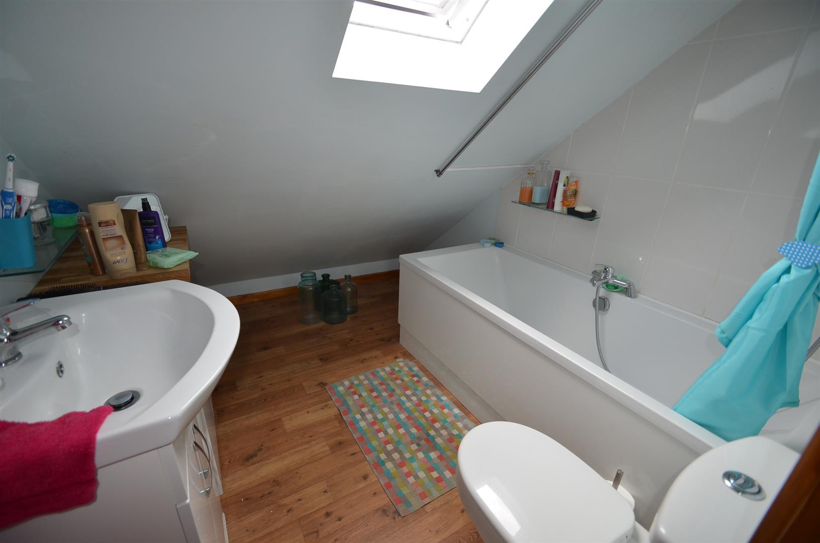 White suite comprising of panelled bath with mixer tap, low level w.c, wash hand basin in vanity unit, tiled walls, heated towel rail, velux window to side.