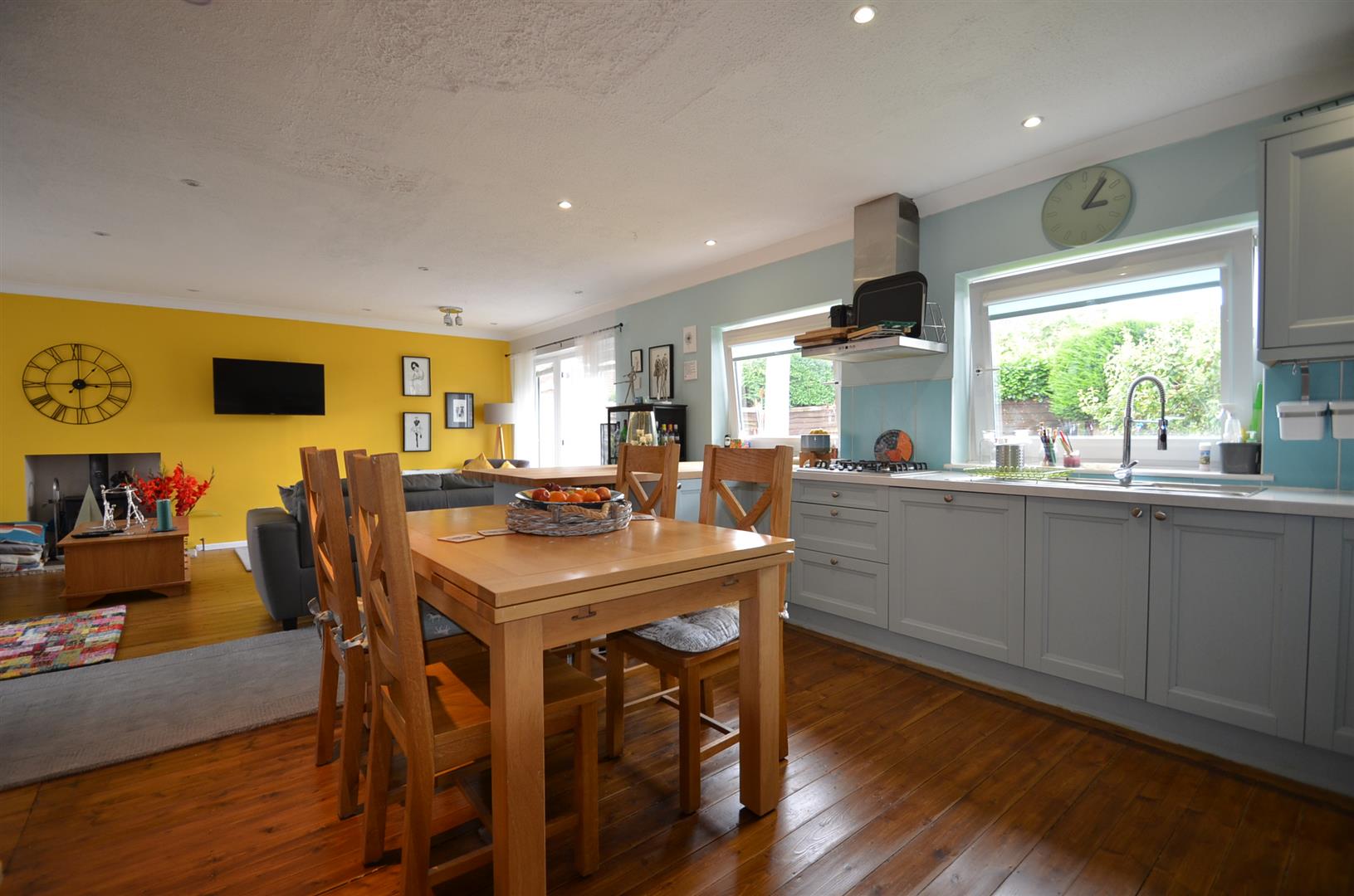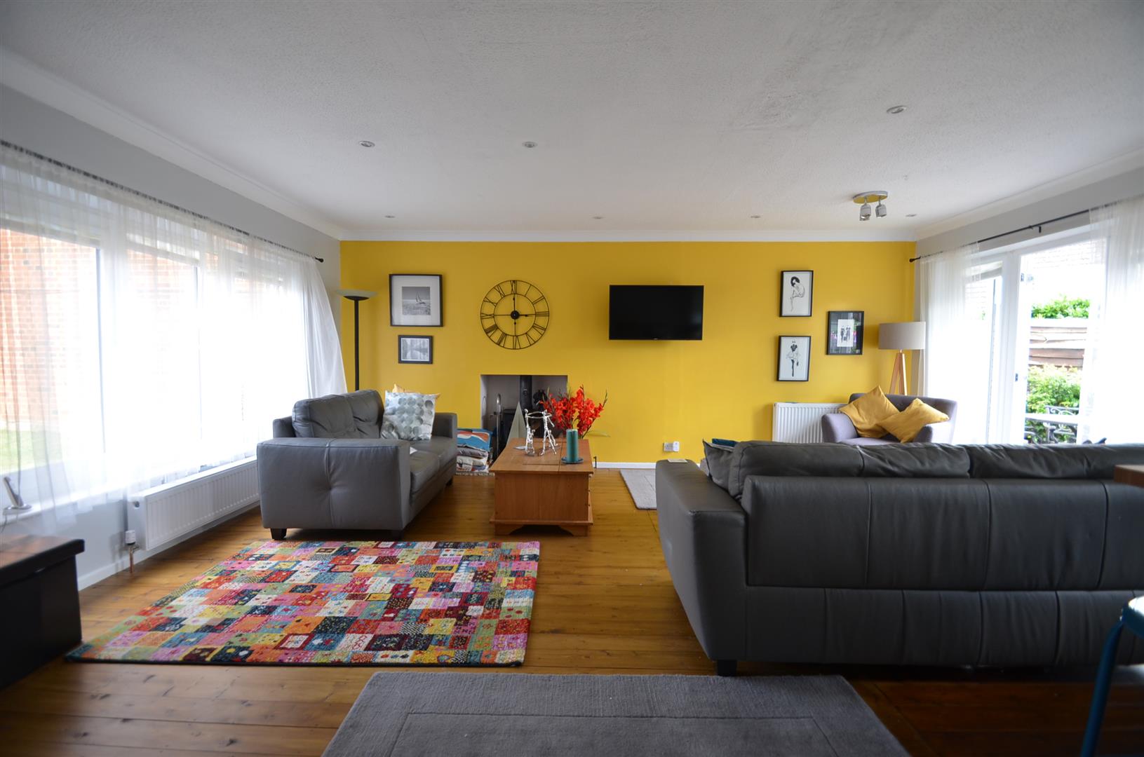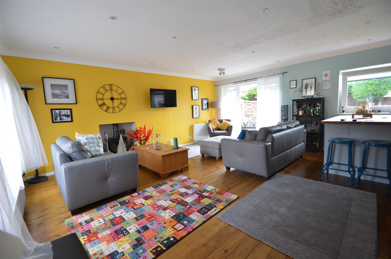 Dual aspect room with uPVC double glazed window to front, French doors to garden, wood flooring, three radiators, open fire with wood burning stove, inset spotlights.