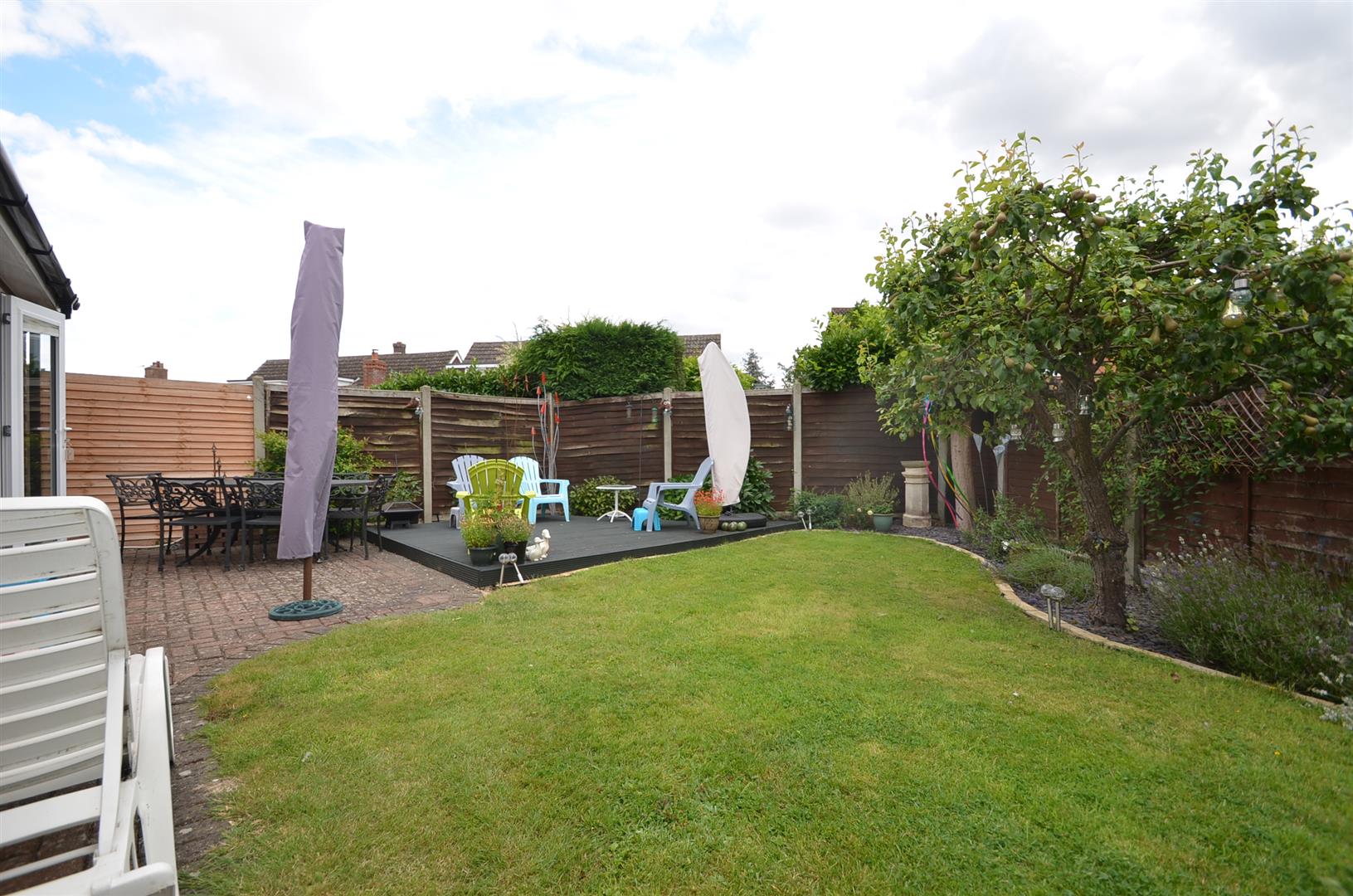 Block paved patio area extending across width of property, rest laid mainly to lawn with flower bed borders, two large garden sheds, raised decked area, gated access to front.