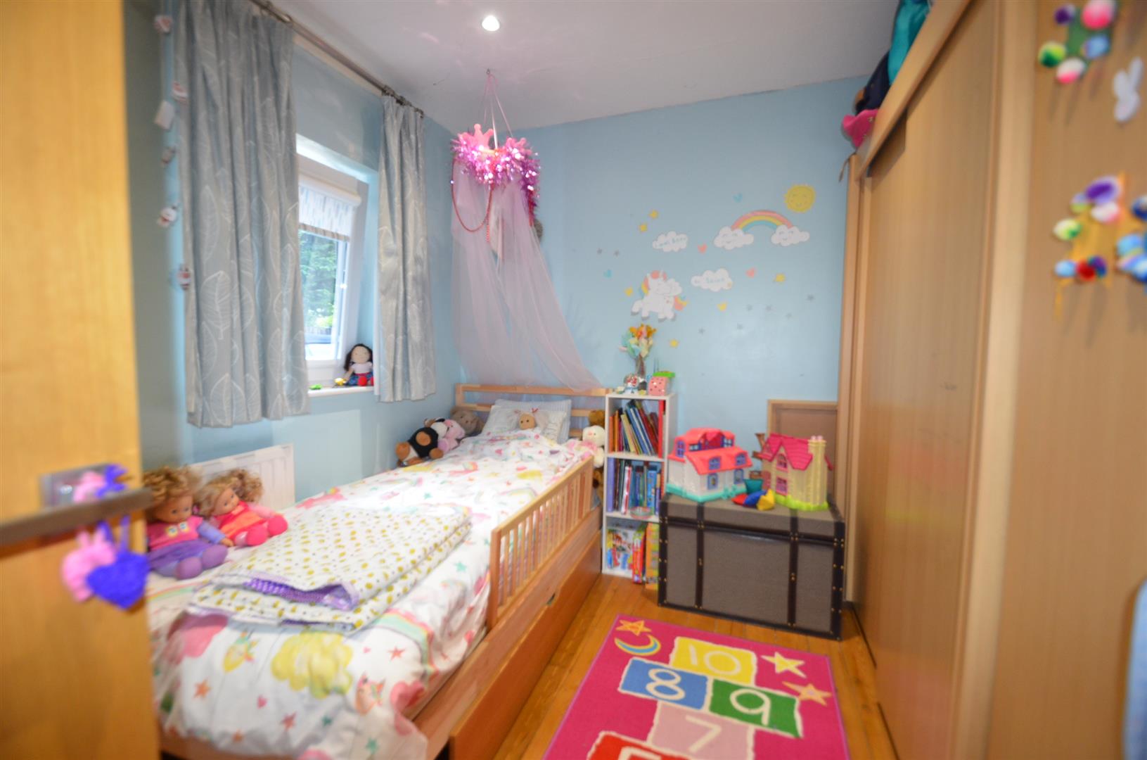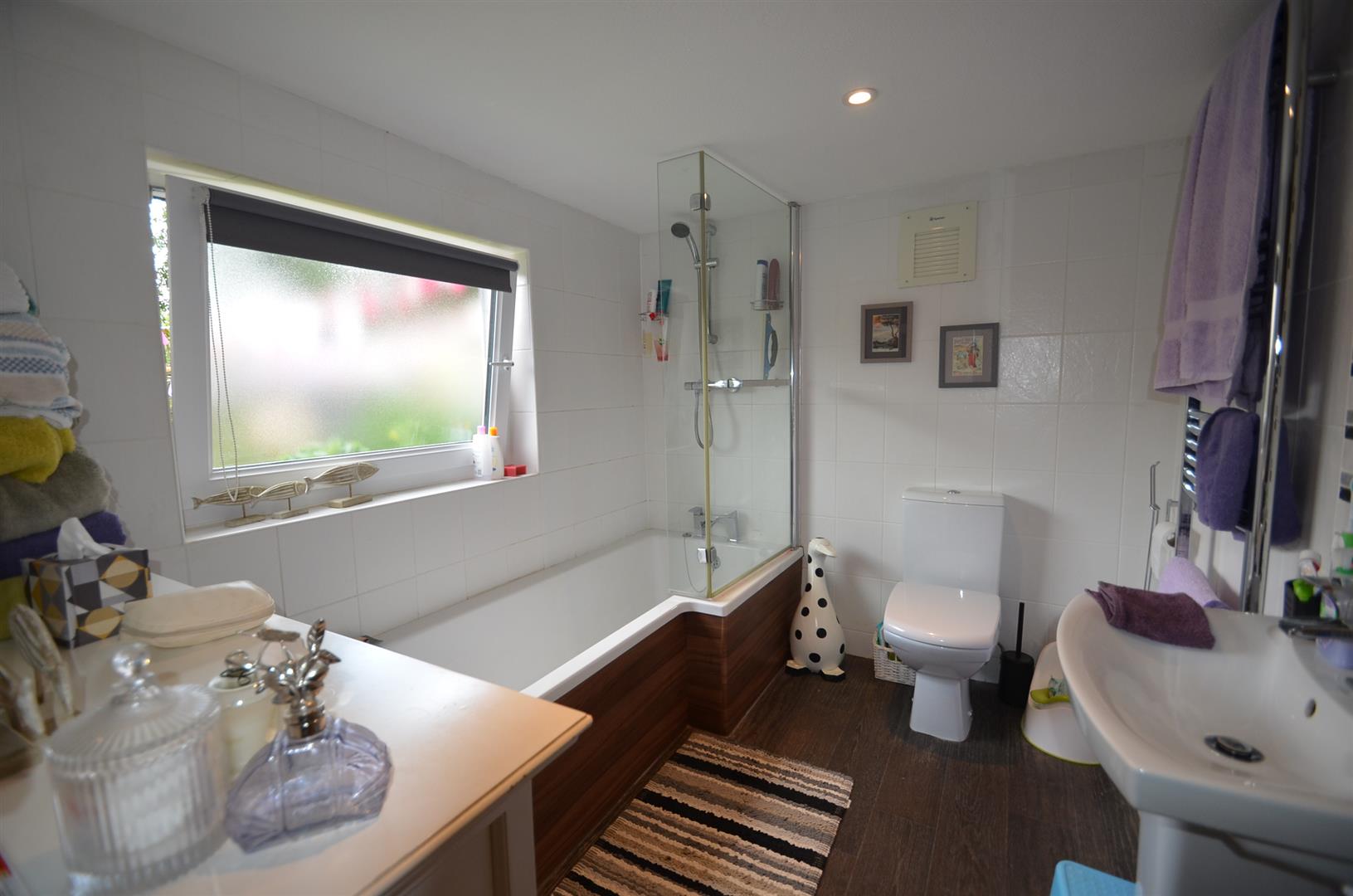 Suite comprising of panelled bath tap and wall mounted mixer shower attachment, glass shower screen, low level w.c, pedestal wash hand basin, heated towel rail, fully tiled walls, , uPVC double glazed window to rear.