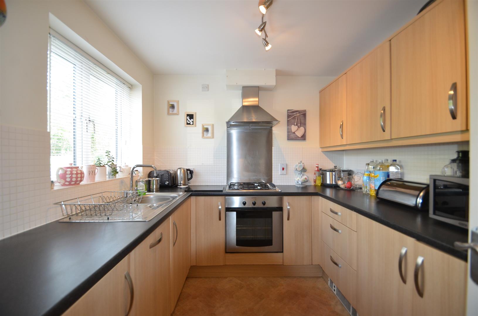 A well fitted kitchen with a range of base and eye level units with roll top work surfaces, tiled splash back, stainless steel sink unit with mixer tap, integrated oven with gas hob and stainless steel chimney hood over, tiled splash back, integrated appl