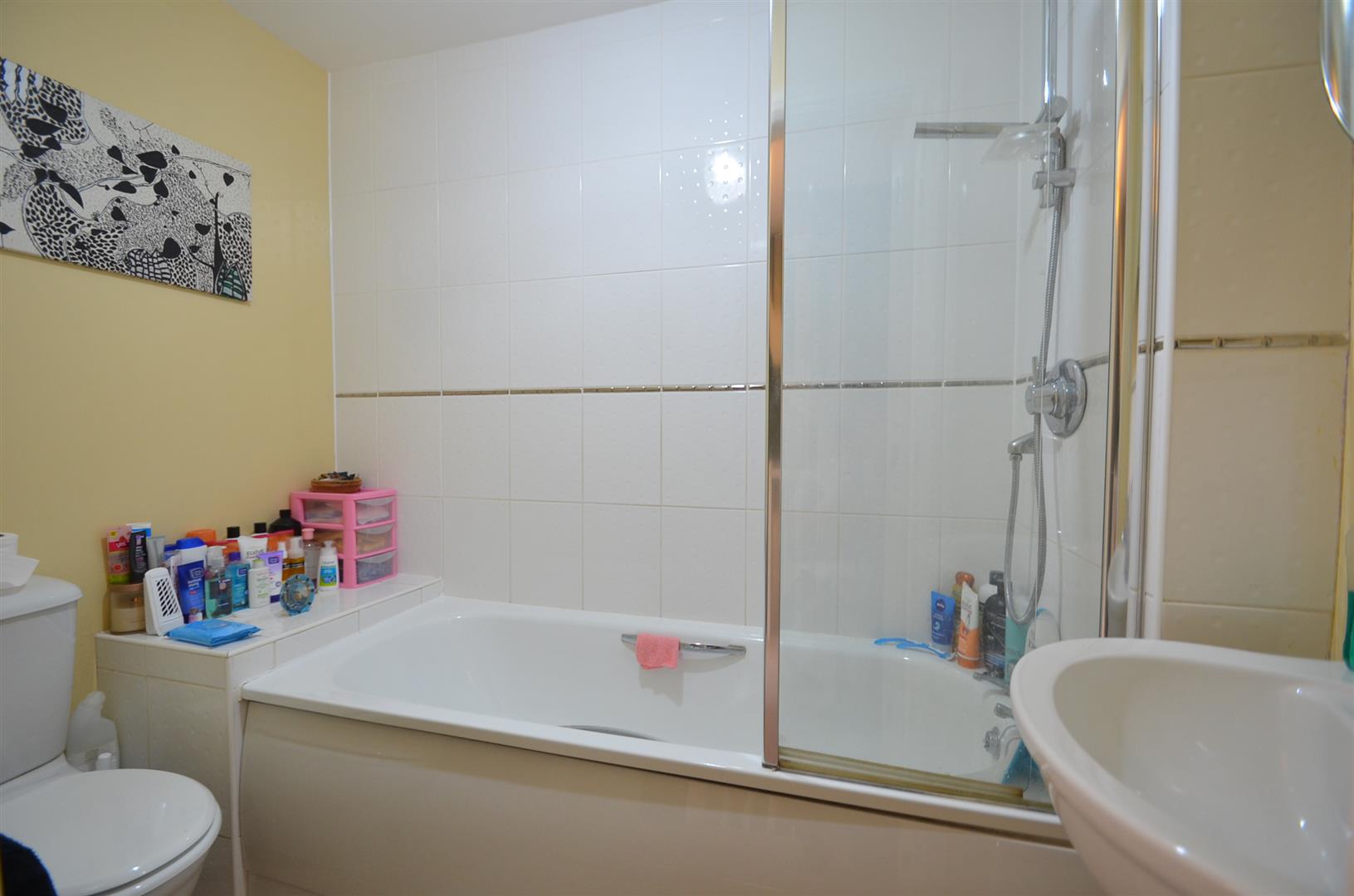 White suite comprising of panelled bath, wall mounted shower, glass shower screen, low level w.c, pedestal wash hand basin, radiator, tiled walls, extractor fan.