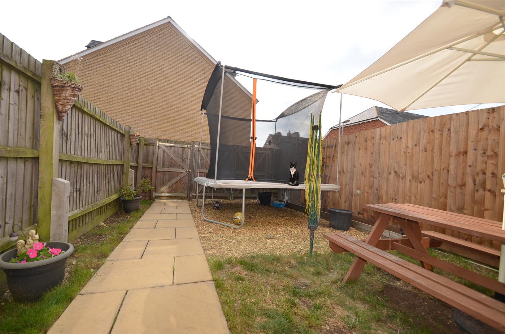 Paved path leading to rear of garden with gated rear access, small lawn area, double opening gates to allow off road parking in garden if required.