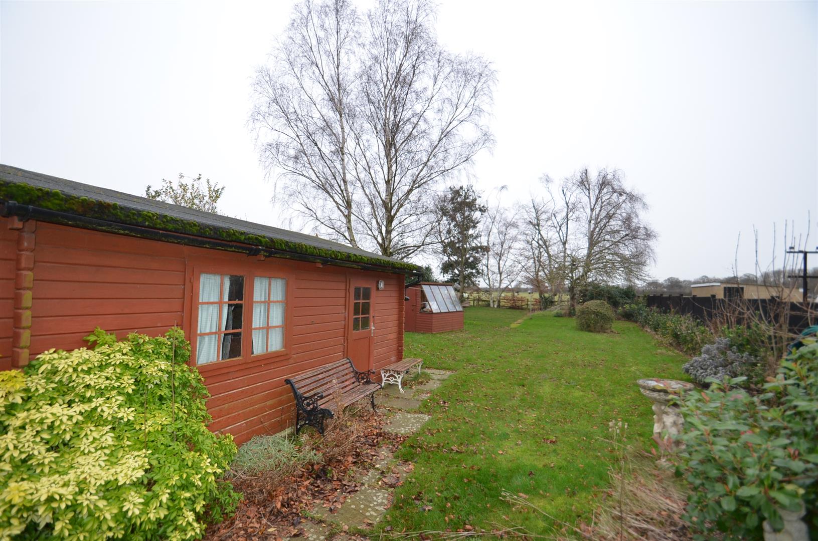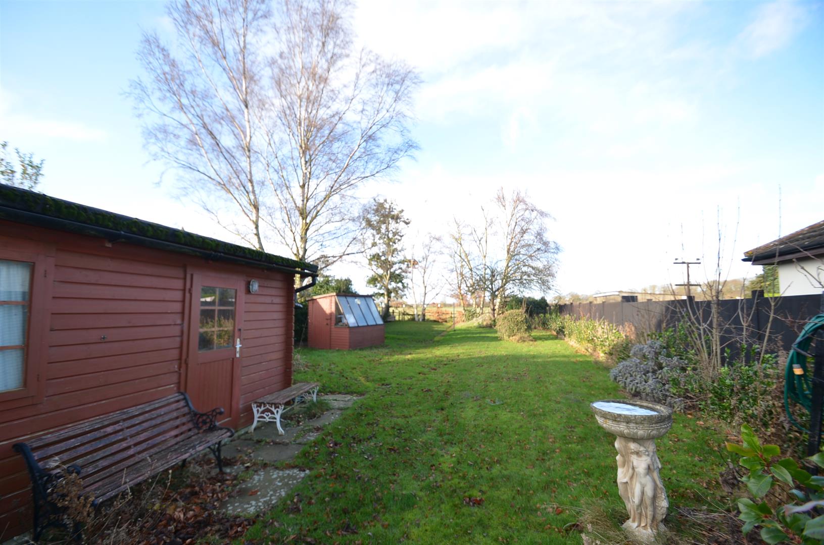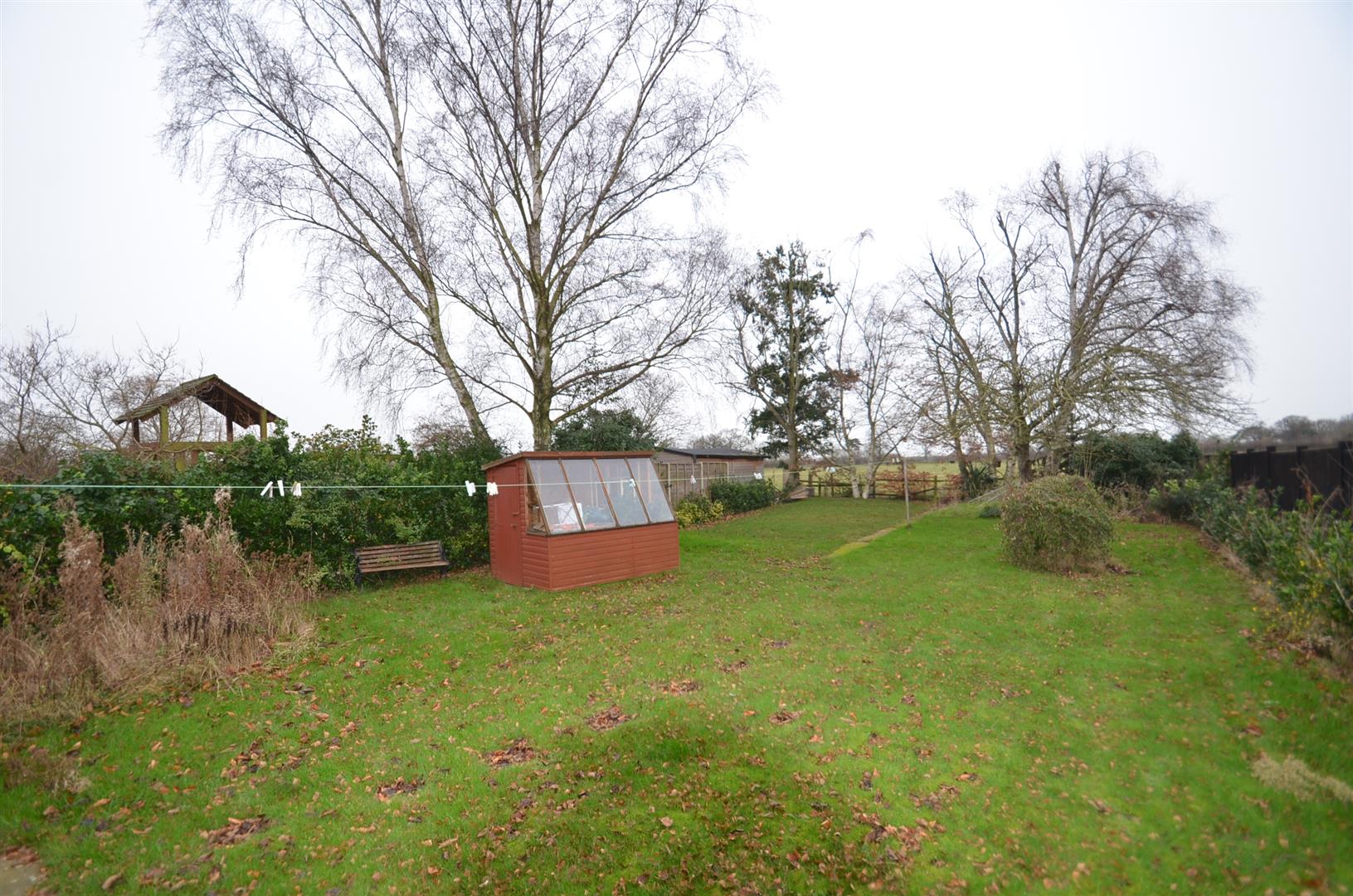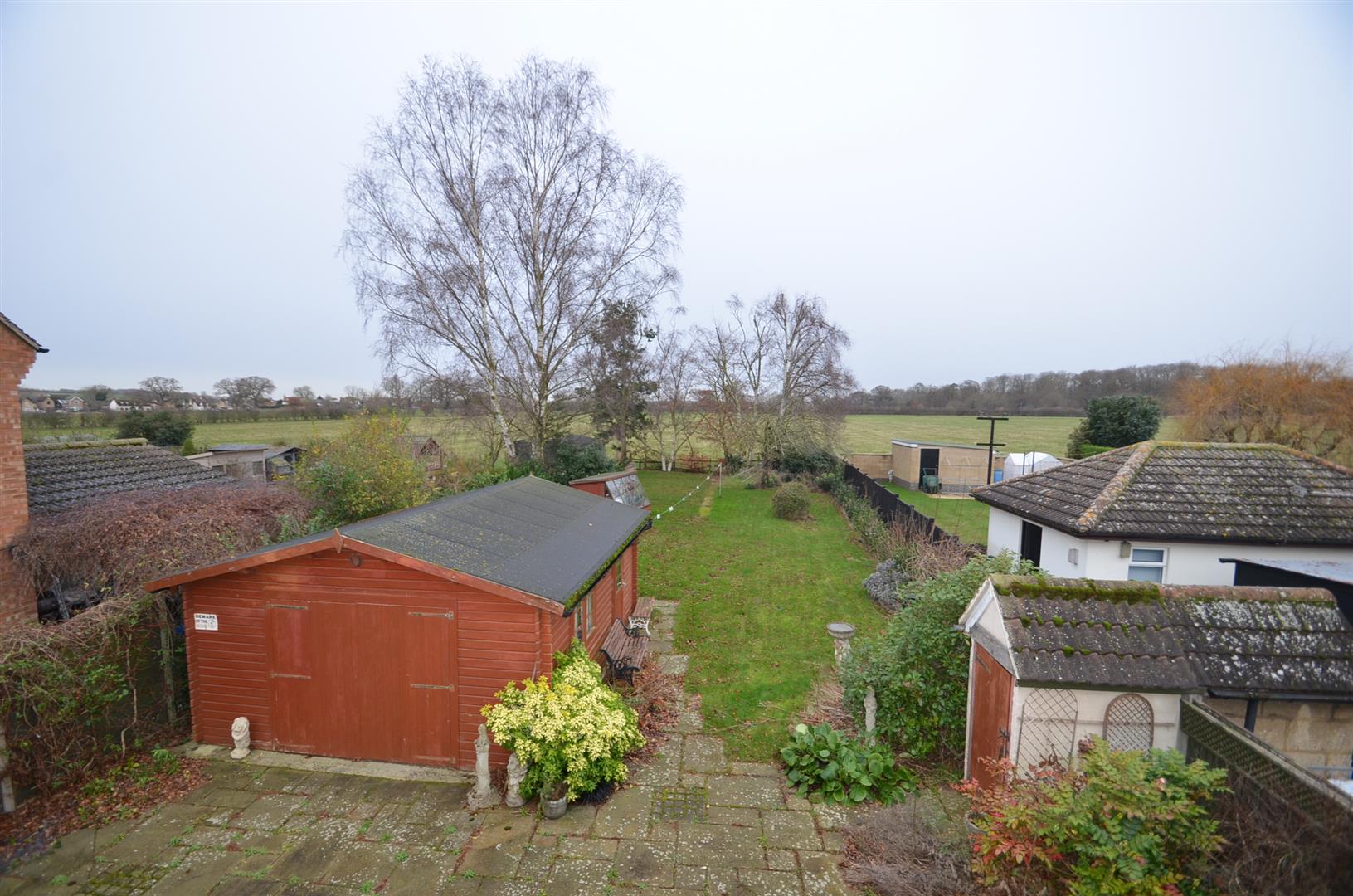 A large garden over 100ft in length and backing onto open farmland, paved patio area, brick build shed, rest laid mainly to lawn with a variety of trees and shrubs.
