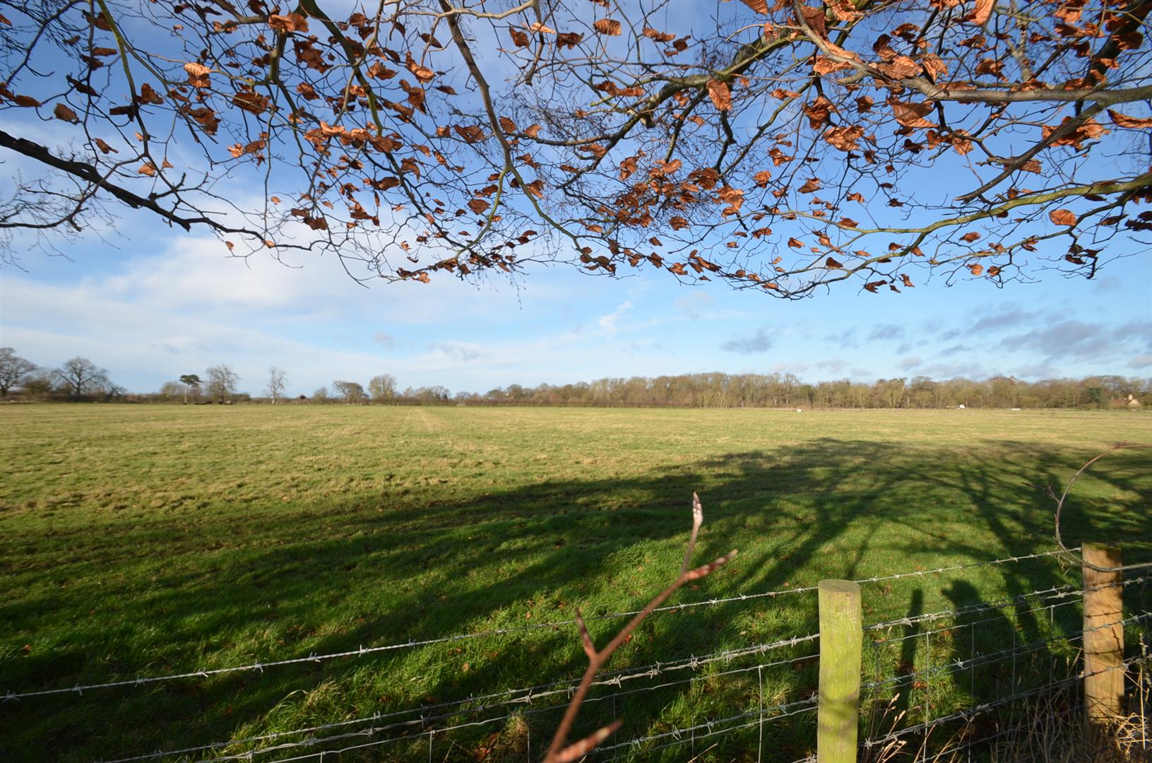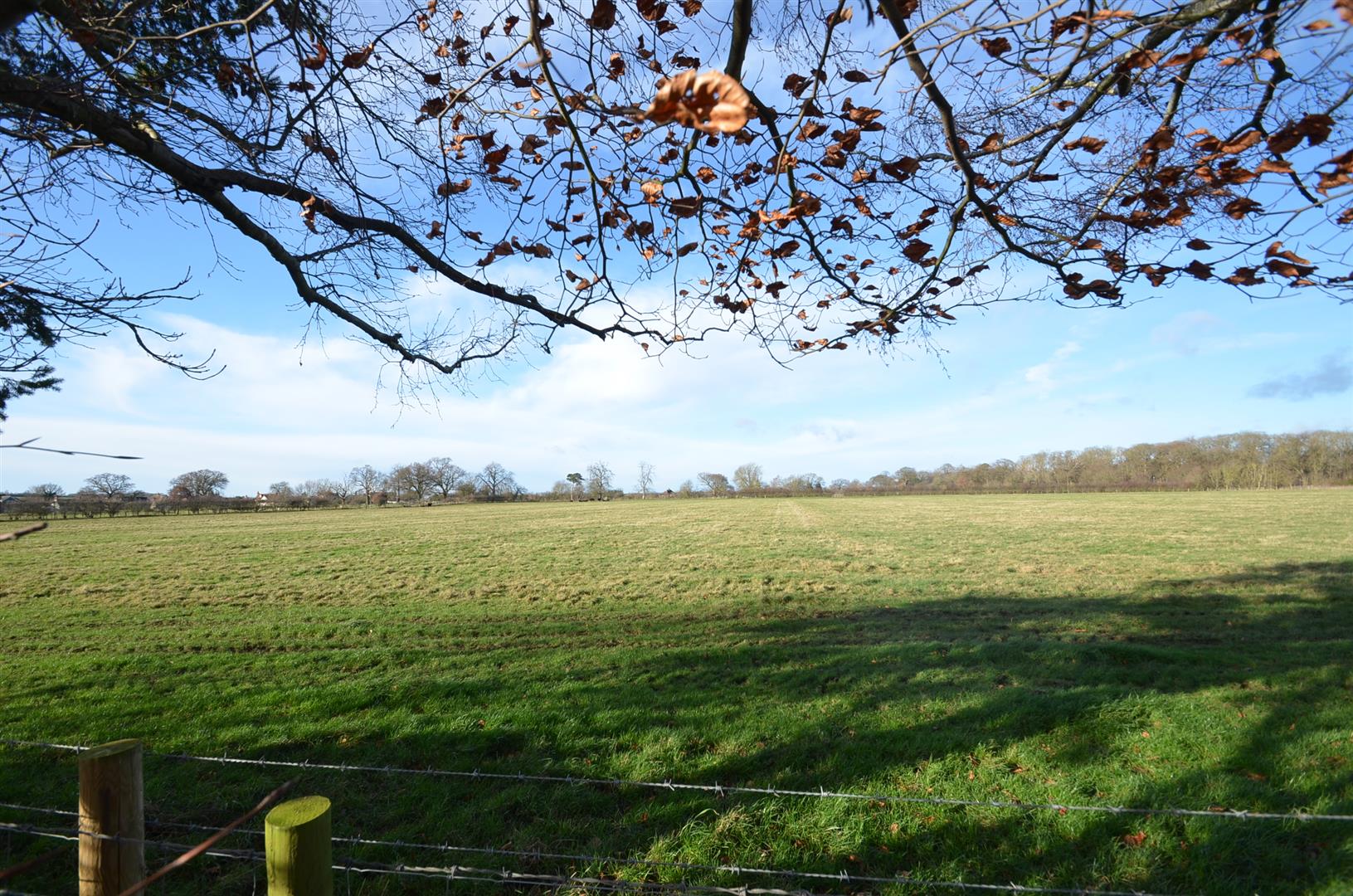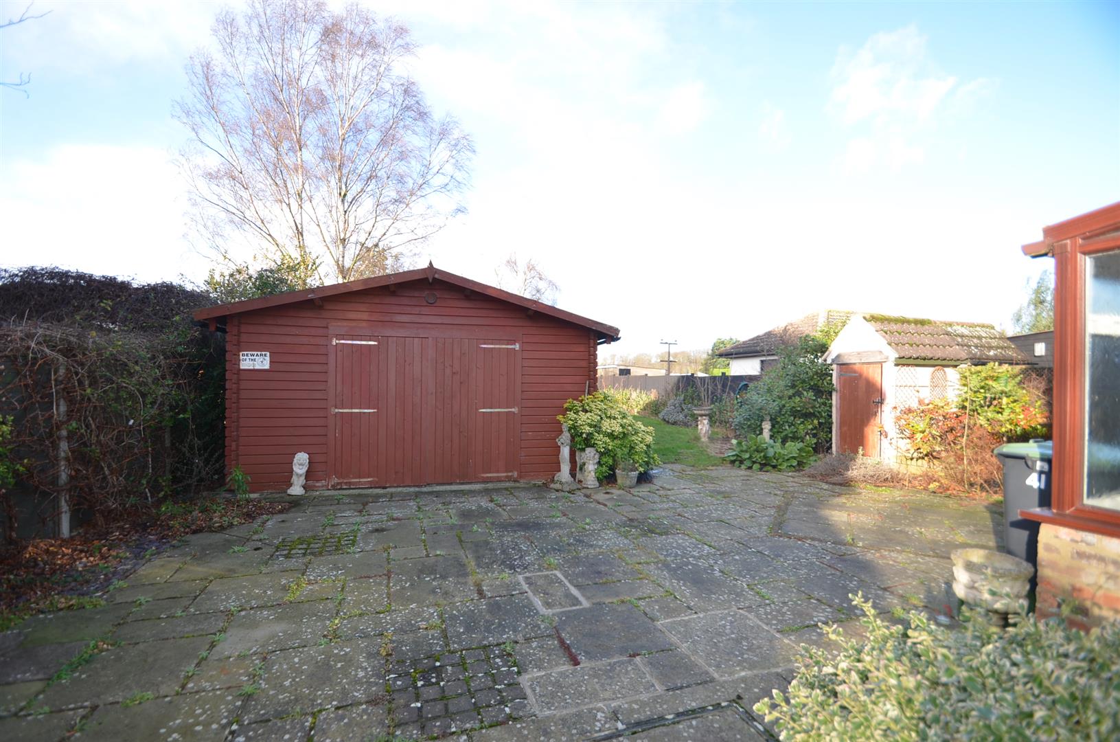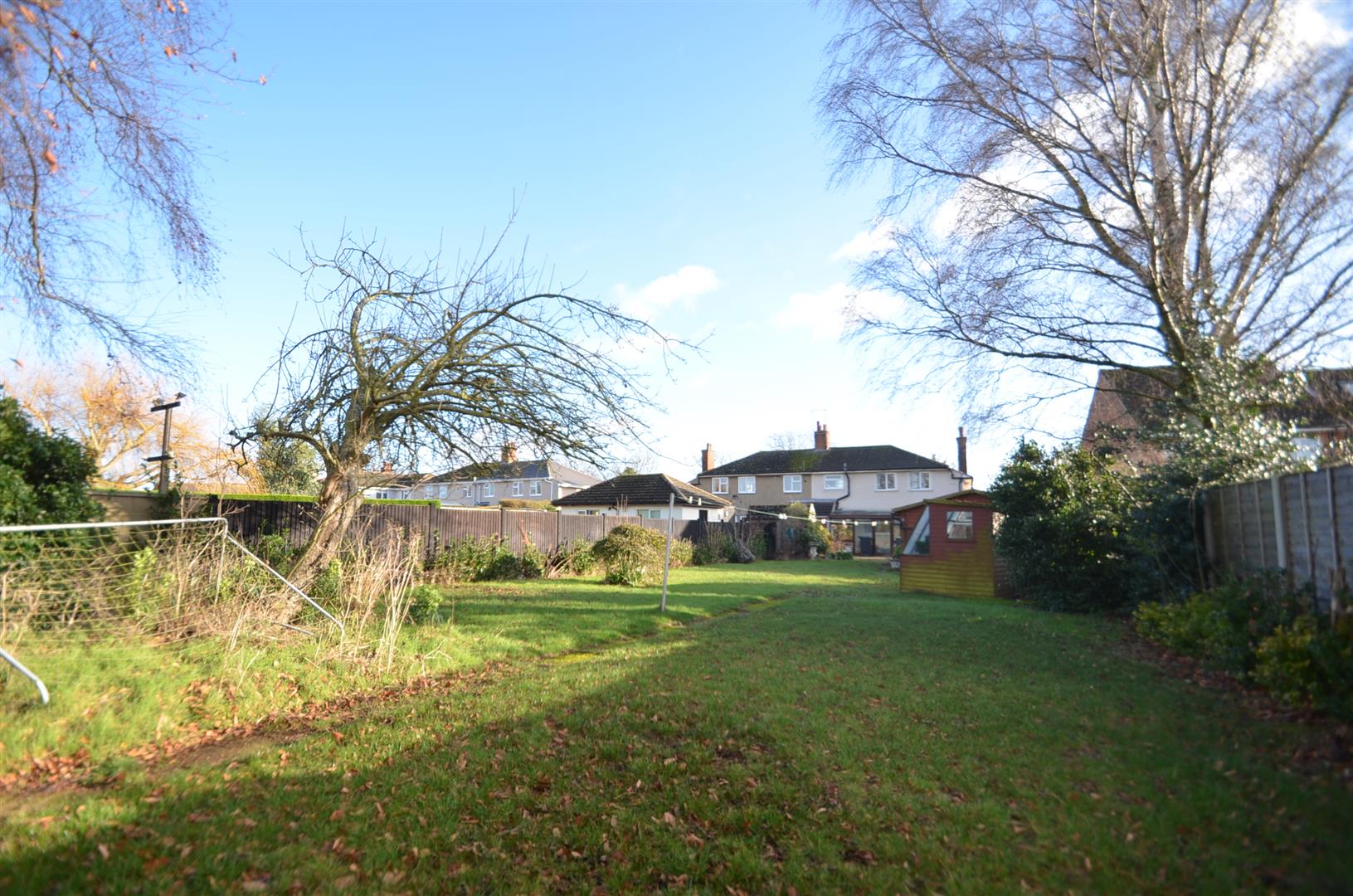 A large garden over 100ft in length and backing onto open farmland, paved patio area, brick build shed, rest laid mainly to lawn with a variety of trees and shrubs.