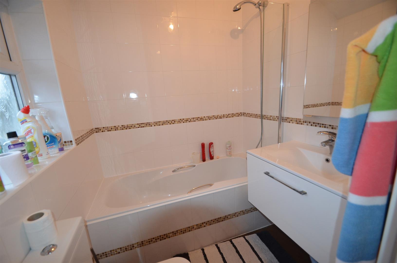 Panelled bath with mixer tap and wall mounted shower attachment, wall mounted wash hand basin, low level w.c, fully tiled walls, uPVC double glazed window to rear.