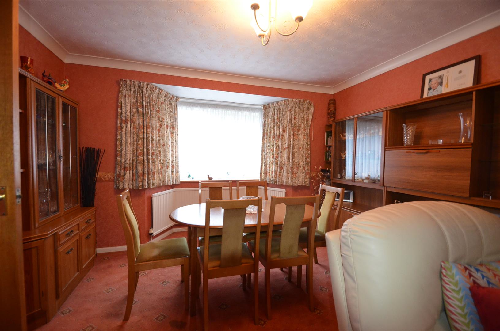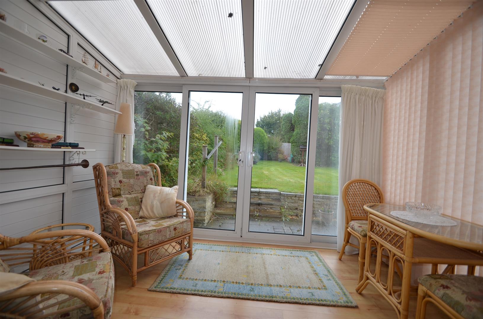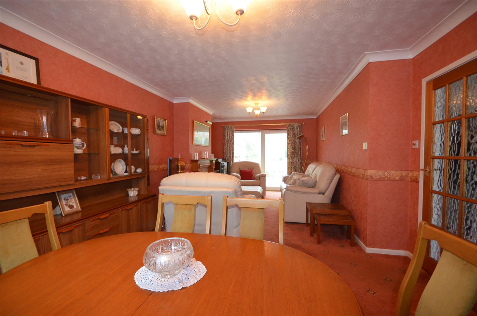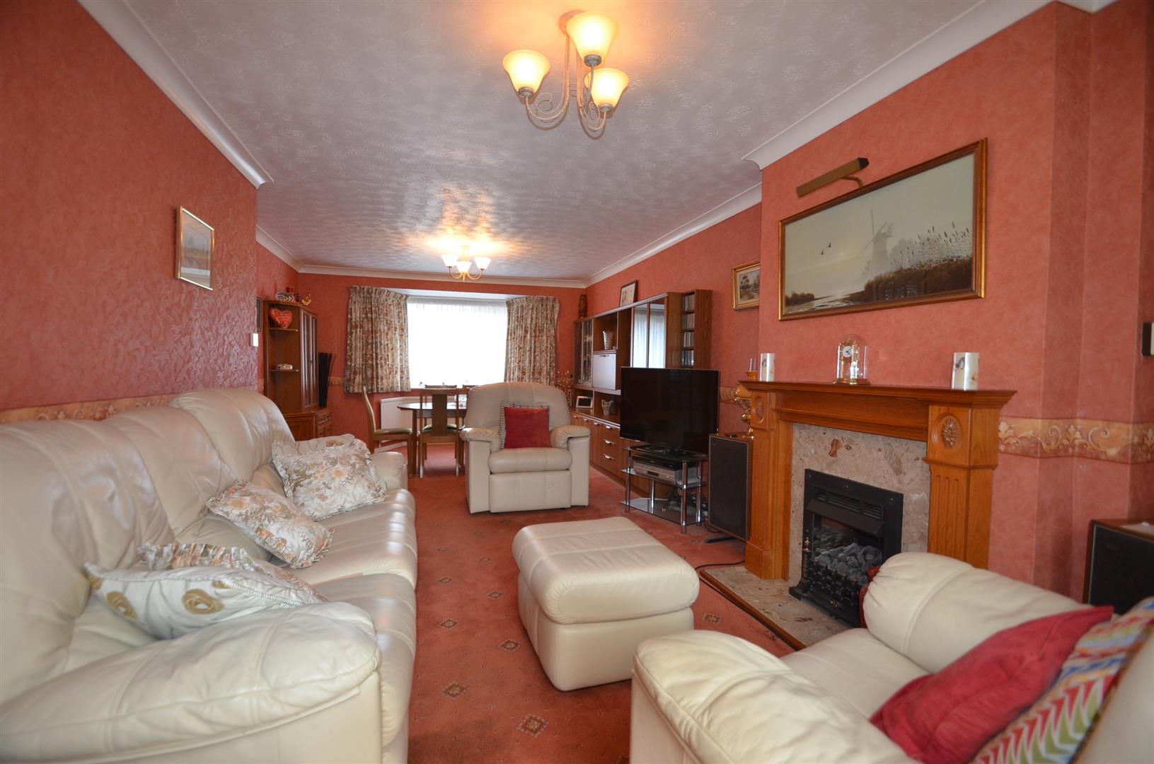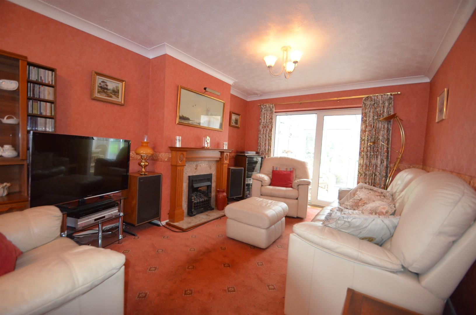 Dual aspect room with uPVC double glazed bay window to front, sliding patio doors to conservatory, radiator, gas fire with marble hearth and wooden surround.