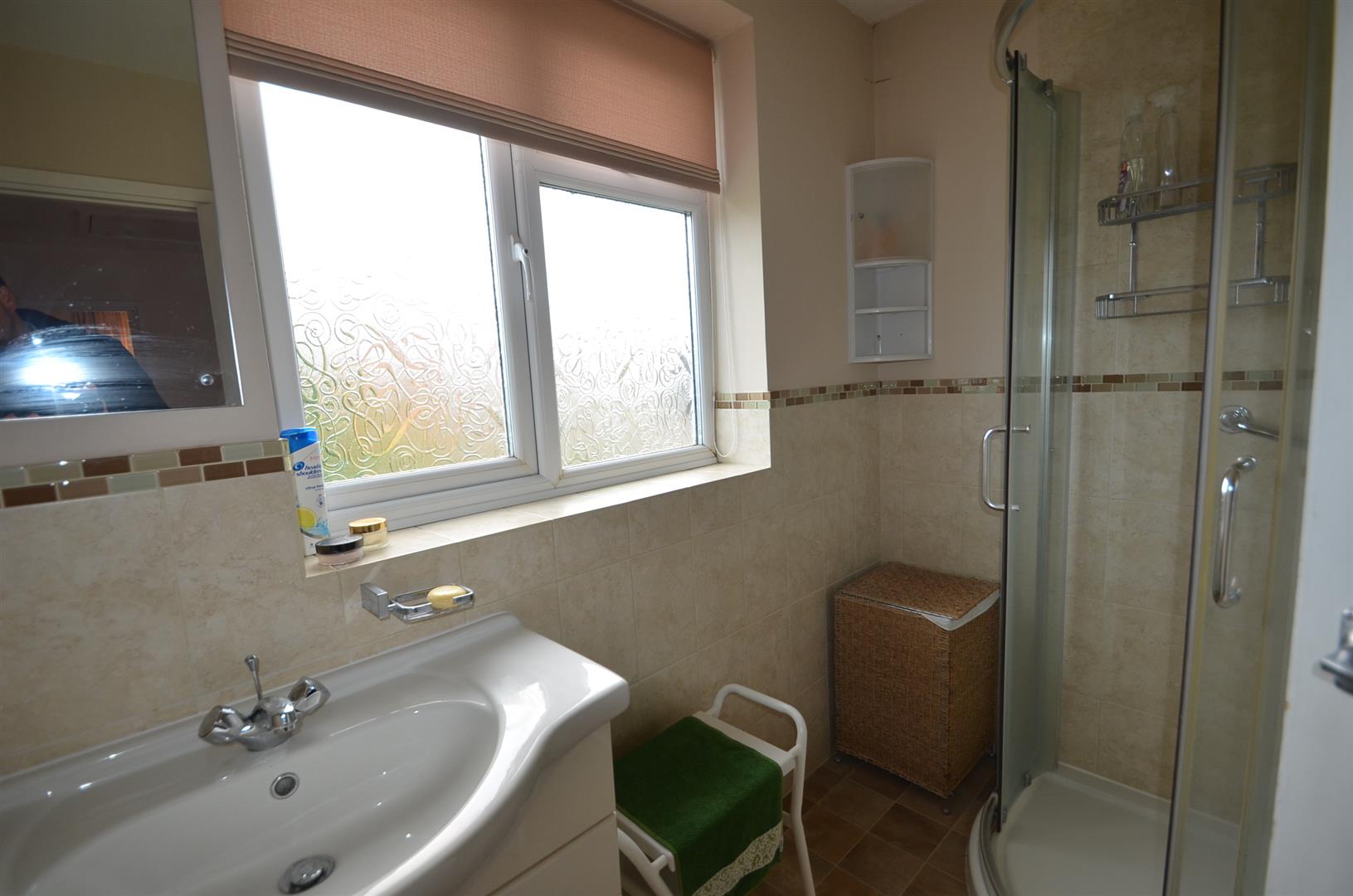 White suite comprising of fully tiled shower cubicle with wall mounted shower, wash hand basin in vanity unit, part tiled walls, uPVC double glazed window to rear.