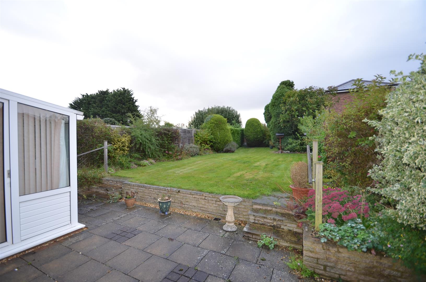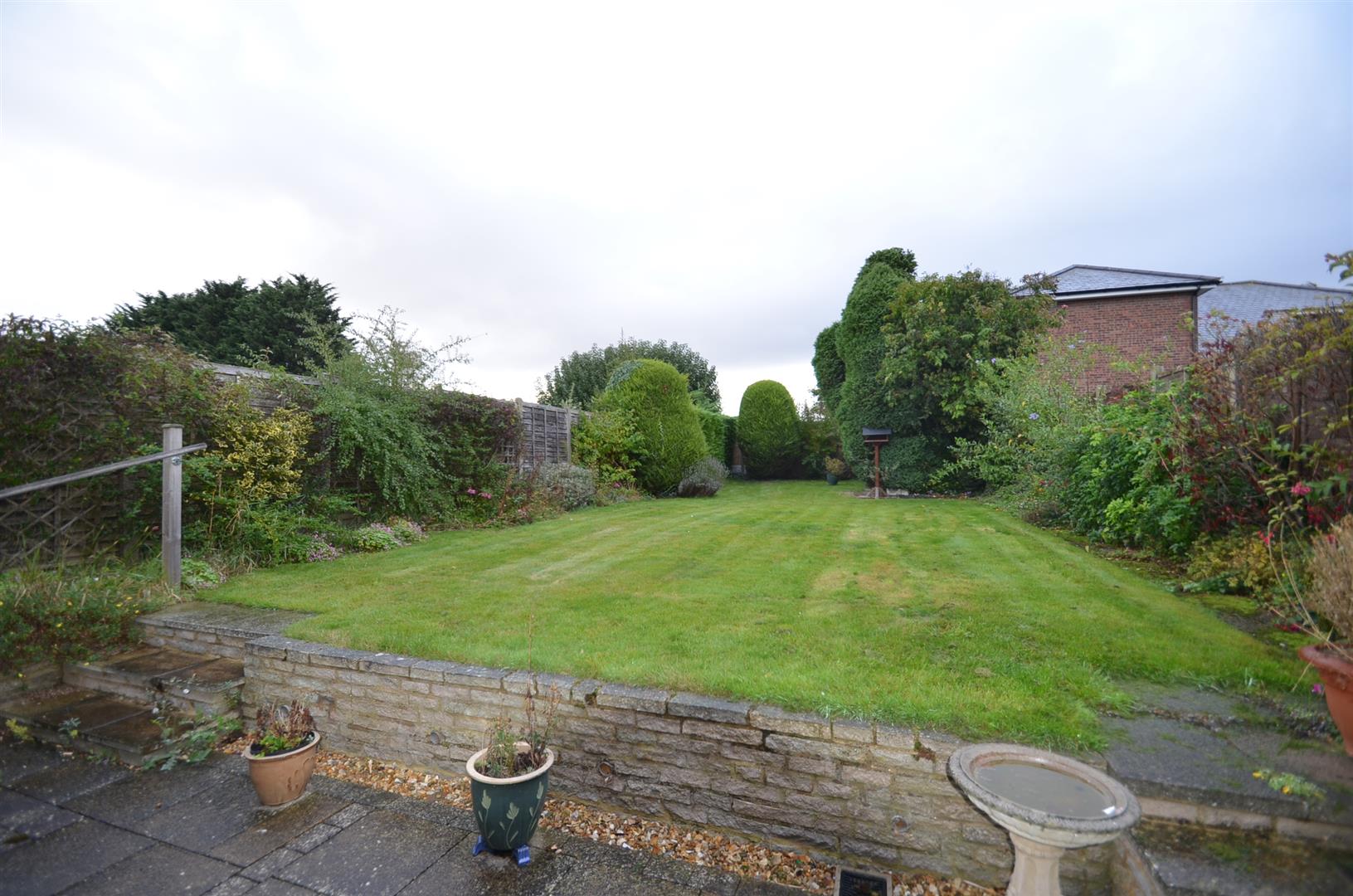 A large fully enclosed garden laid mainly to lawn with mature trees and shrubs, paved patio area.
