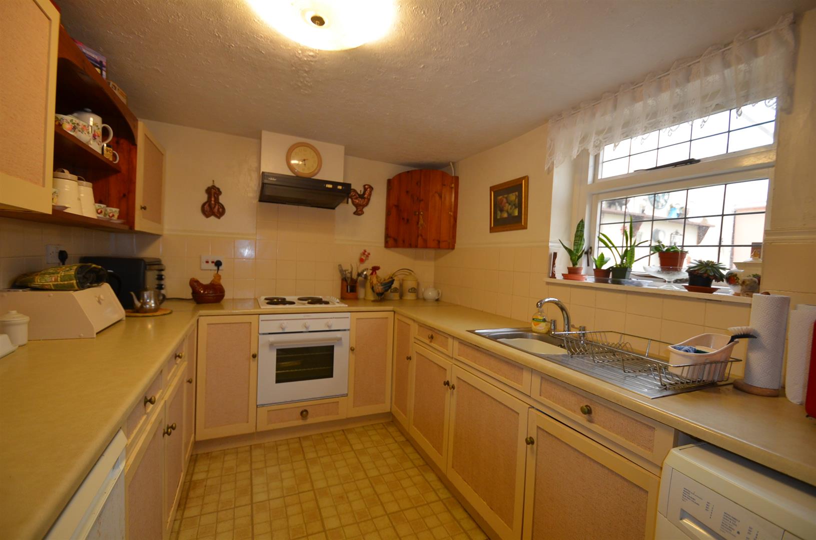 Range of base and eye level units with roll top work surfaces, stainless steel sink unit with mixer tap, integrated oven and hob, plumbing for washing machine, radiator, window to rear.
