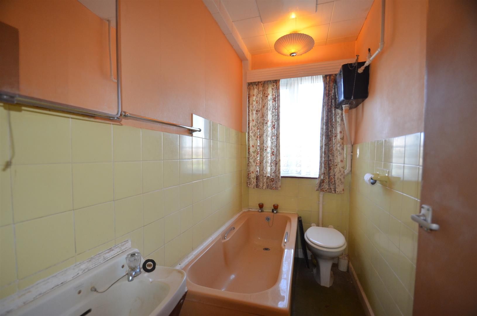 Suite comprising of panelled bath, w.c, wash hand basin, part tiled walls, window to rear.