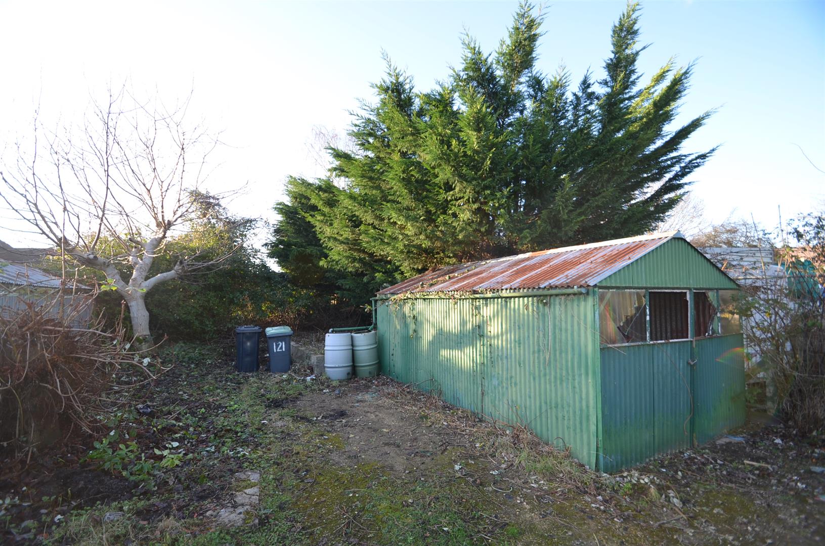 A large pre fabricated garage in poor condition, rest of the garden with space for parking or to create a garden area.