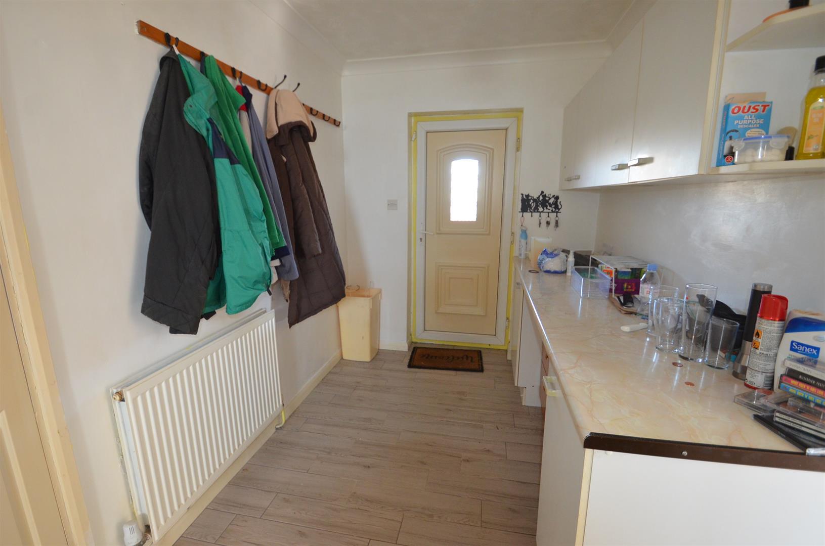 uPVC door to front, radiator, tiled floor, range of base and wall mounted unit with work surfaces over, plumbing for washing machine.