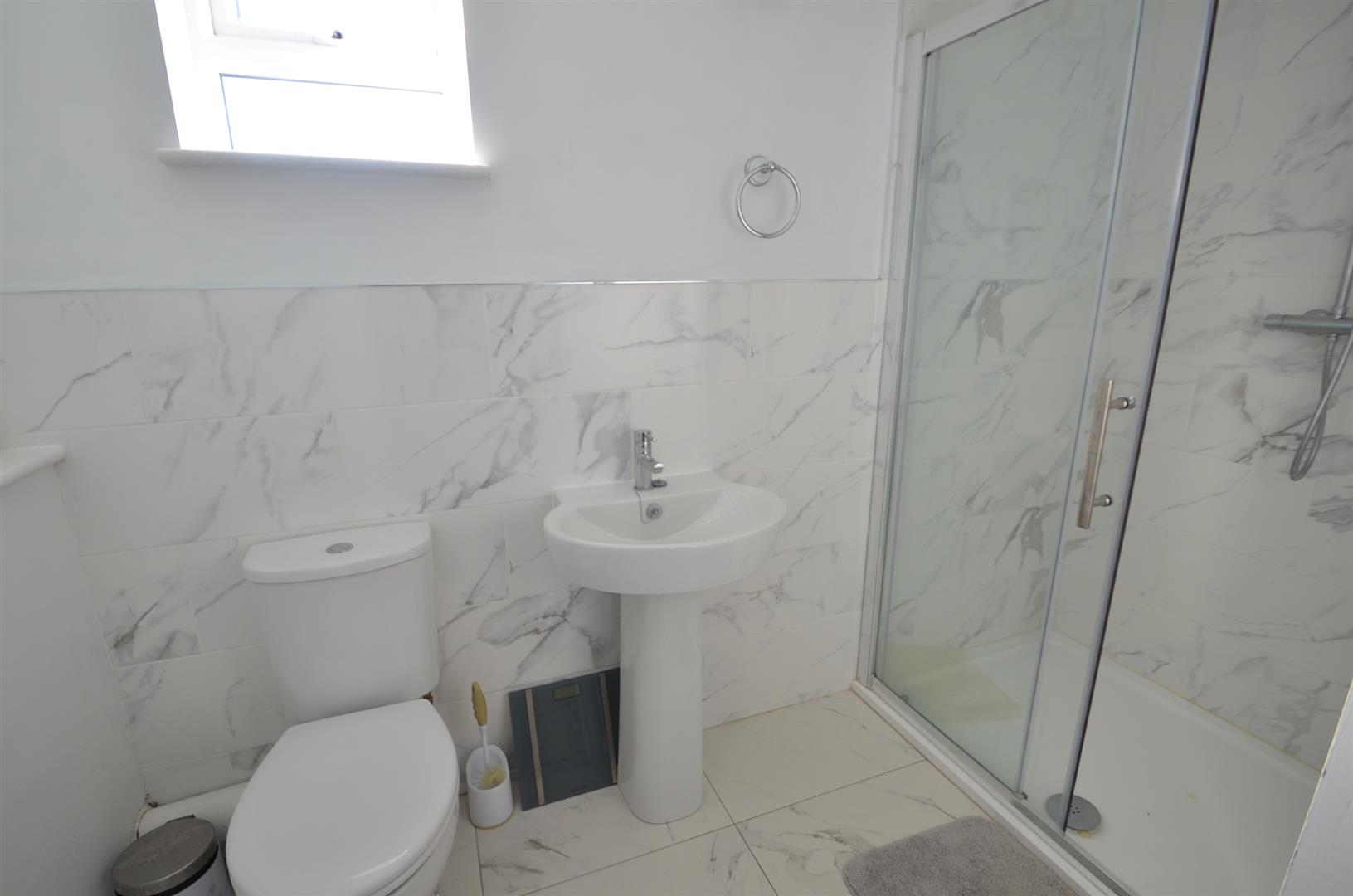 Refitted white suite comprising of large walk in shower enclosure, low level w.c, pedestal wash hand basin, part tiled walls, tiled floor, heated towel rail, window to rear.
