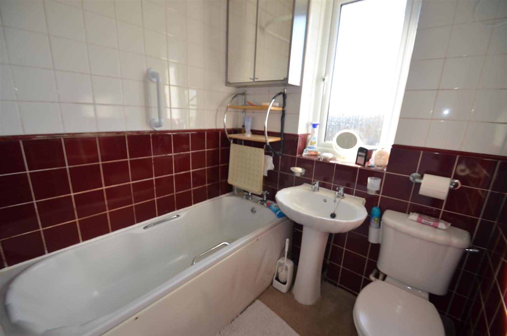 White suite comprising of enclosed bath with panel, wall mounted shower, low level w.c, pedestal wash hand basin, fully tiled walls, window to rear, heated towel rail.
