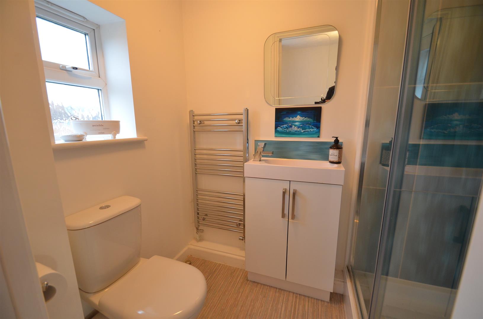 White suite comprising of large double shower cubicle with wall mounted shower, wash hand basin in vanity unit, low level w.c, heated towel rail, uPVC double glazed window to rear.