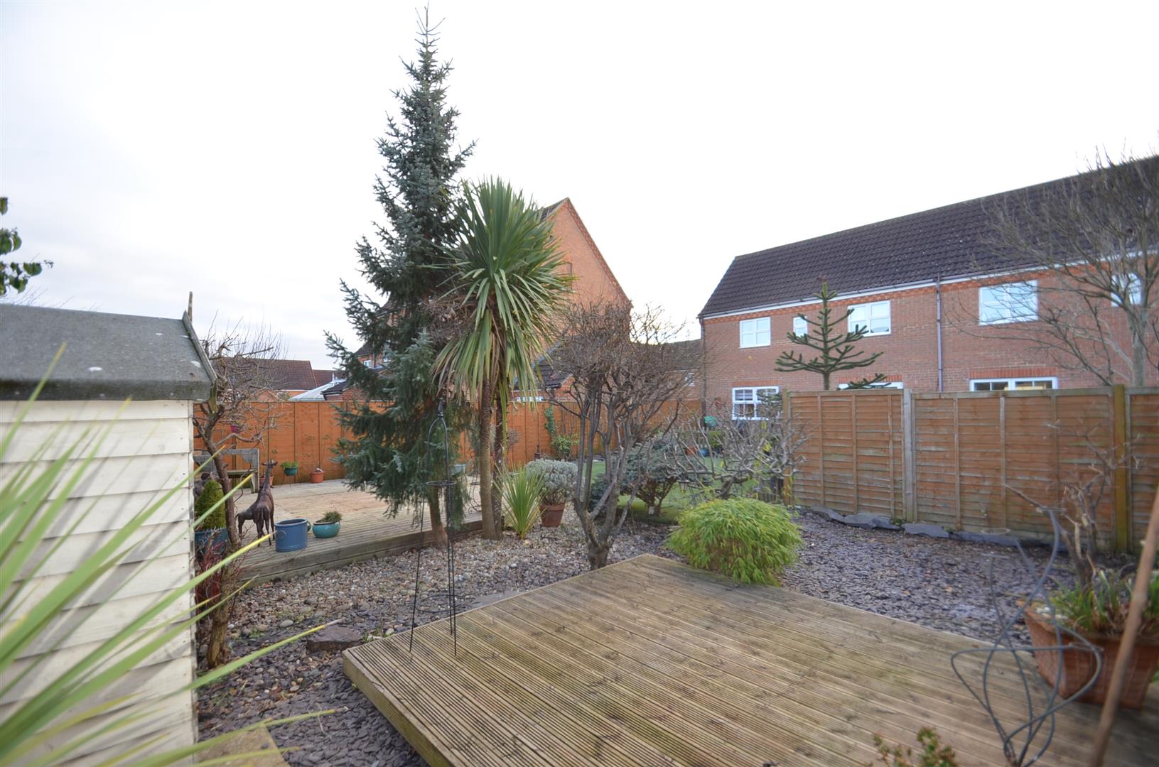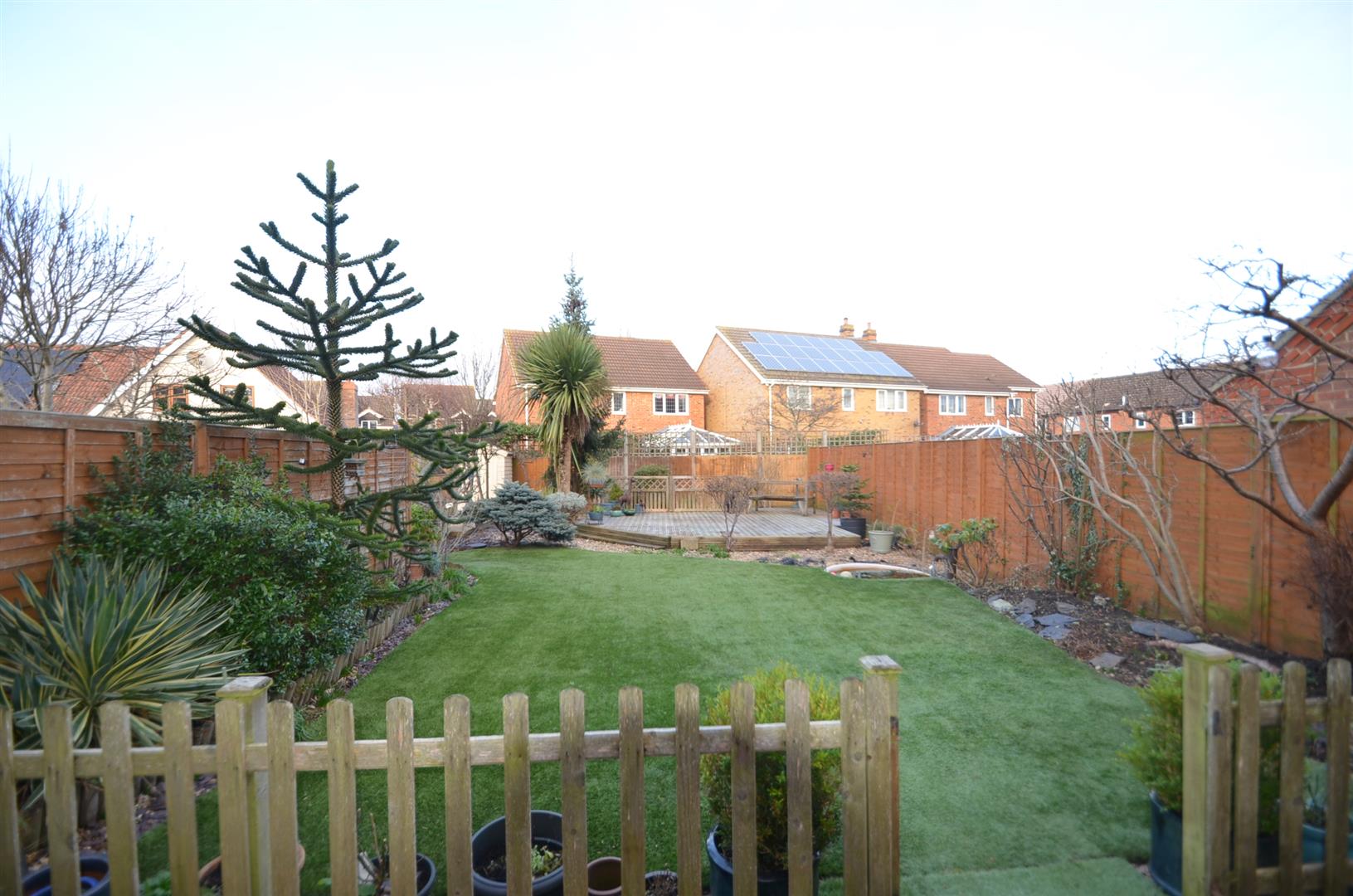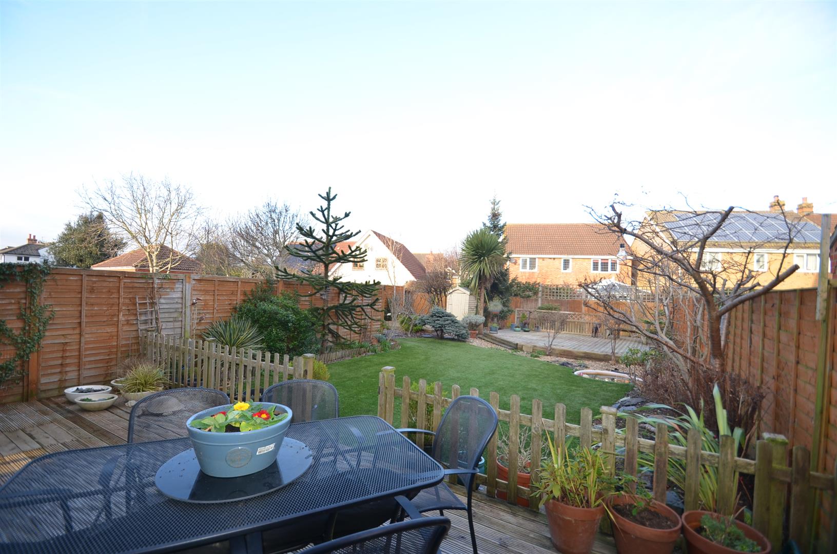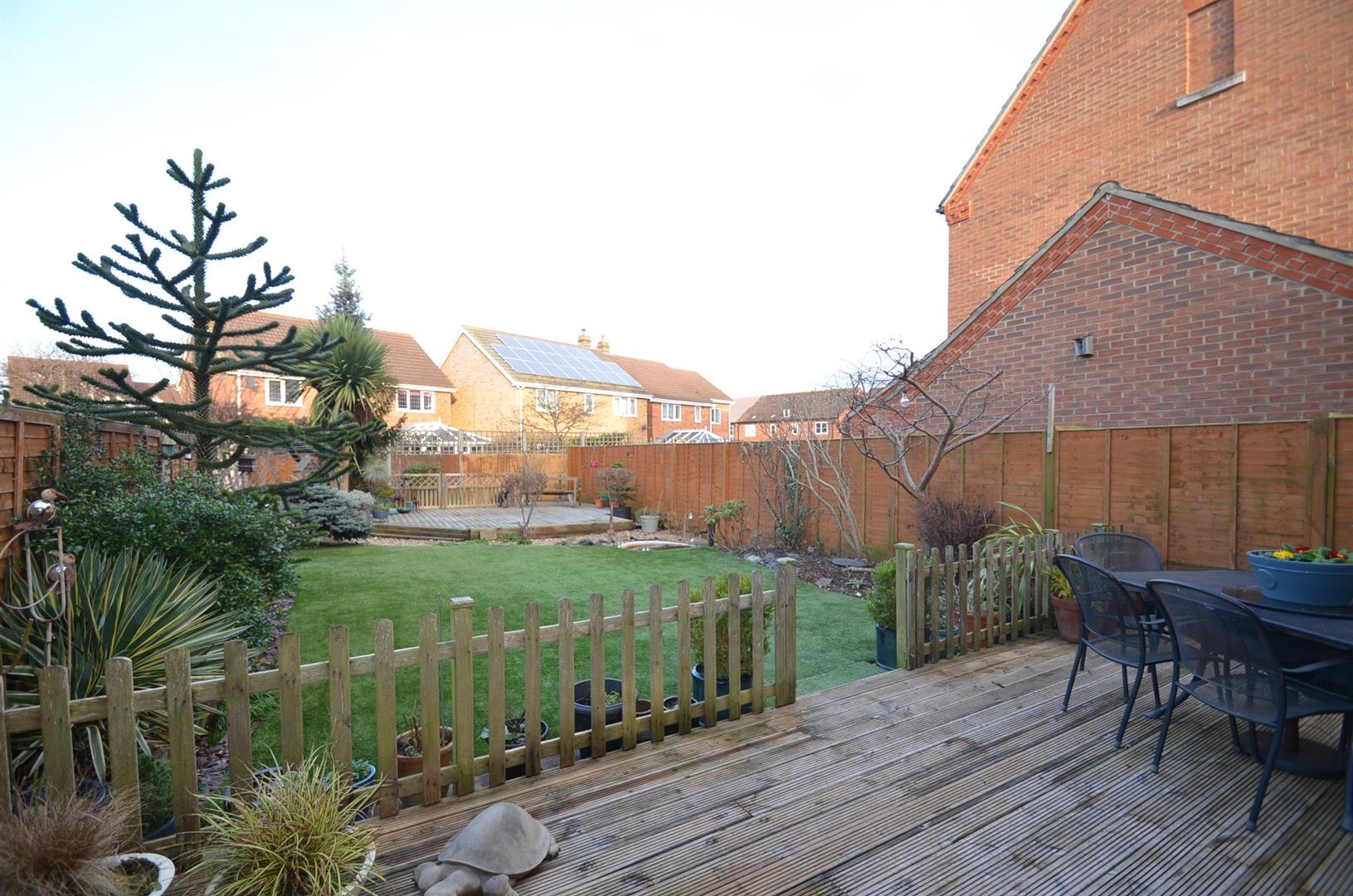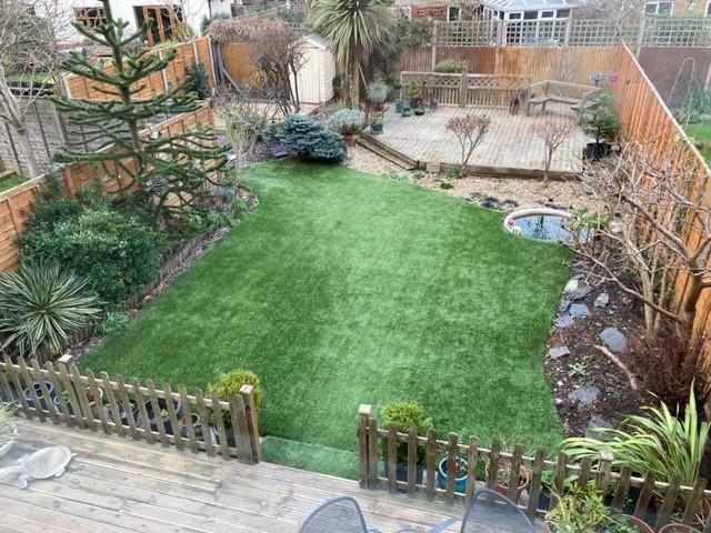 A large, fully enclosed garden with large decked area, rest laid mainly to artificial lawn well stocked with flowers and shrubs, gated access to rear.