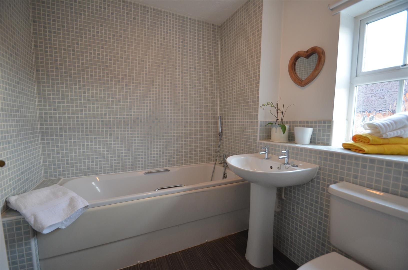 White suite comprising of panelled bath with mixer tap and wall mounted shower attachment, pedestal wash hand basin, low level w.c, part tiled walls, radiator, uPVC double glazed window to front.