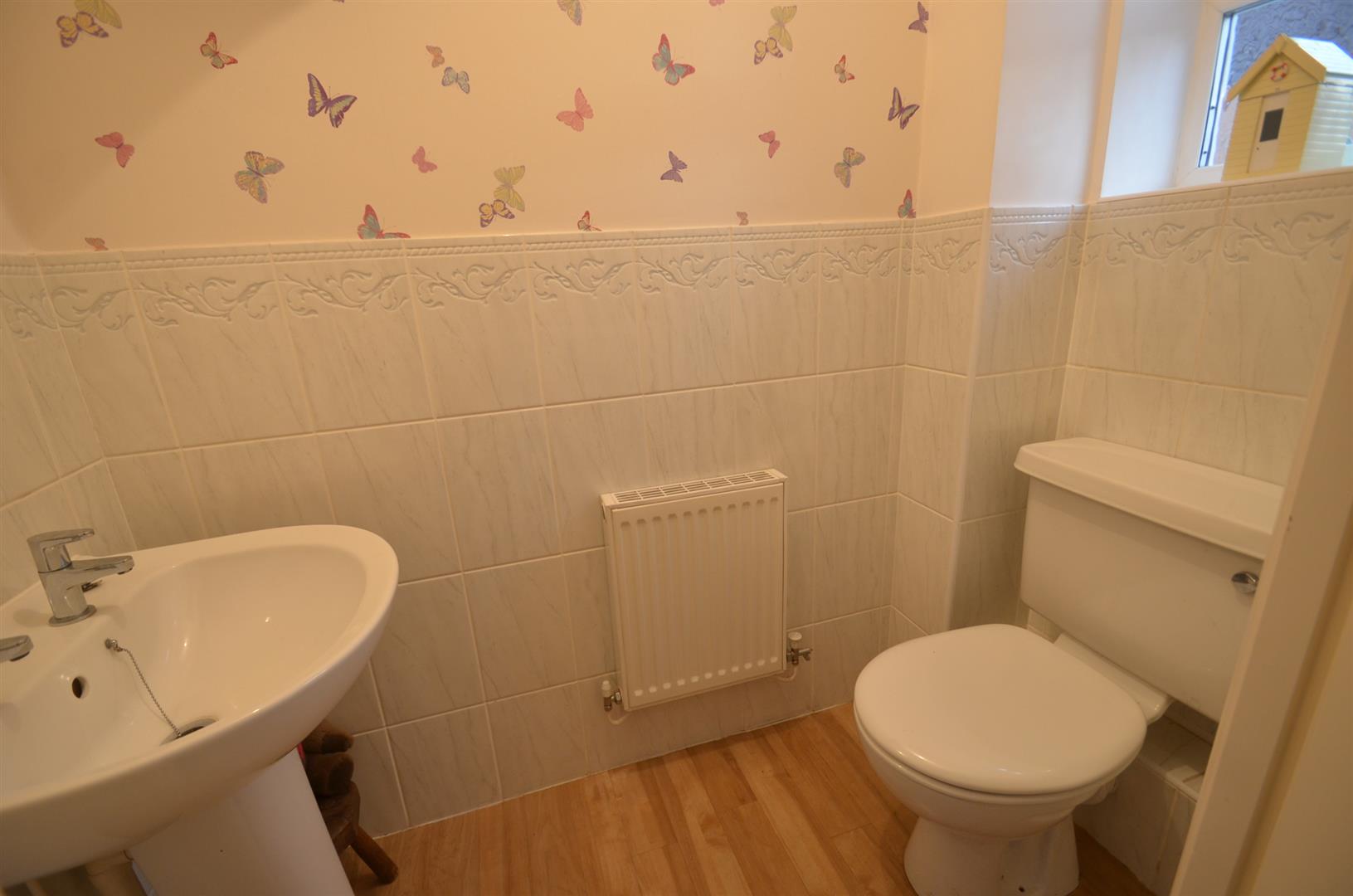 White suite comprising of low level w.c, pedestal wash hand basin, part tiled walls, radiator, fuseboard, uPVC double glazed window to front.
