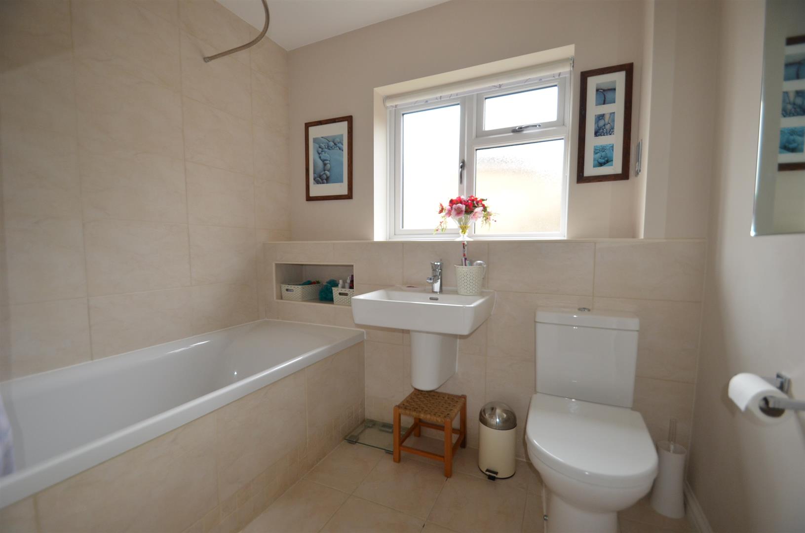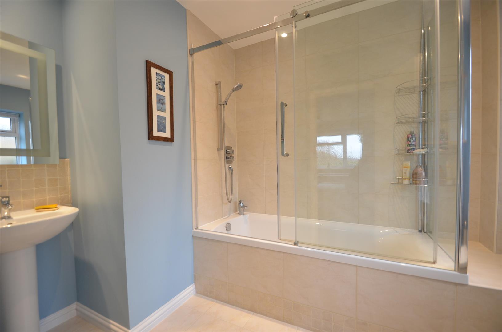 White suite comprising of enclosed bath with mixer tap, wall mounted shower, glass shower screen, low level w.c, pedestal wash hand basin, heated towel rail, part tiled walls, tiled floor, inset spotlights, window to side.