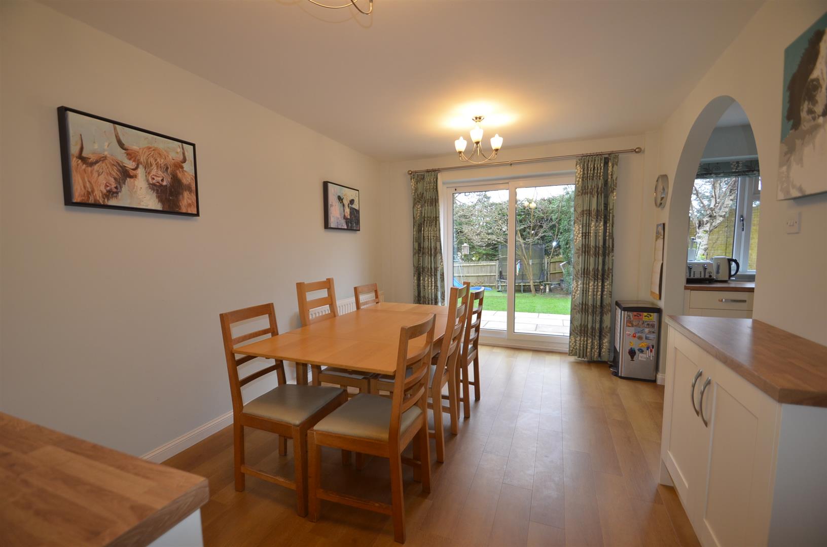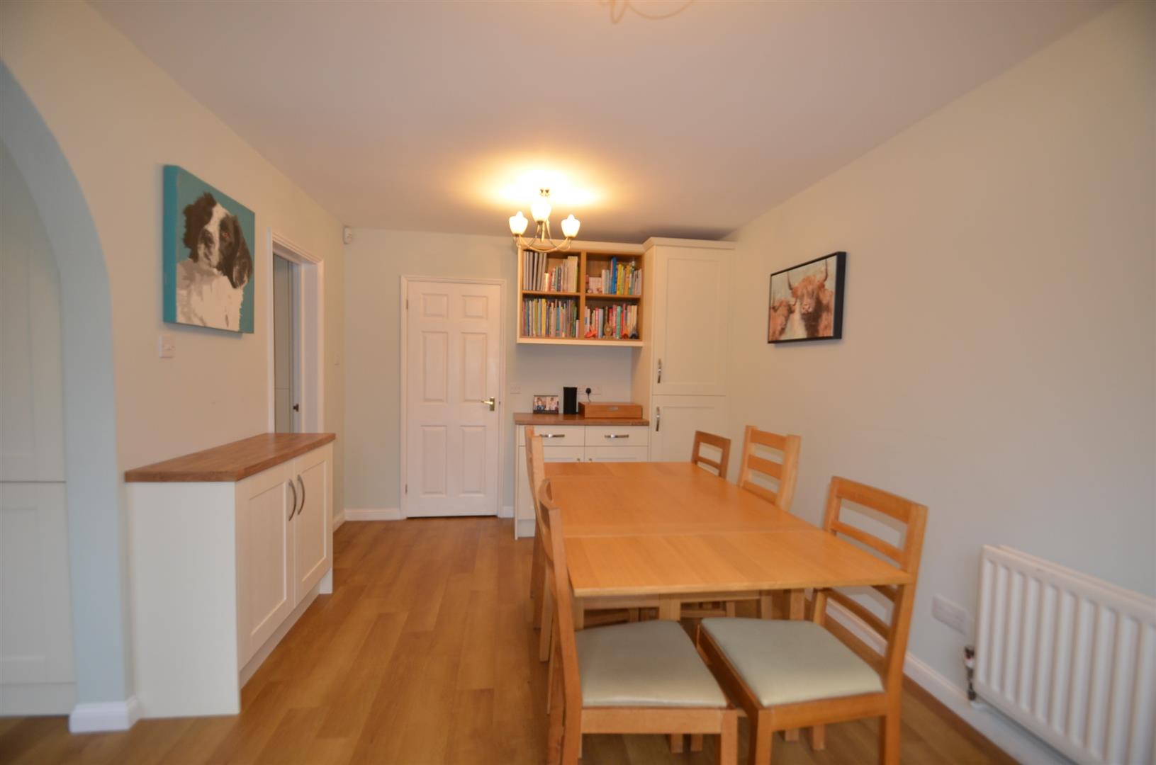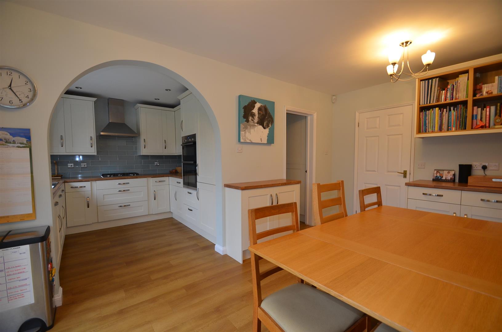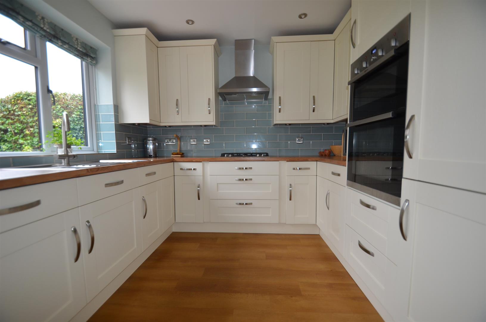 Fitted kitchen with a range of base and eye level units with roll top work surfaces, inset stainless steel sink unit with mixer tap, tiled splashback, integrated appliances include eye level double oven, dishwasher, fridg