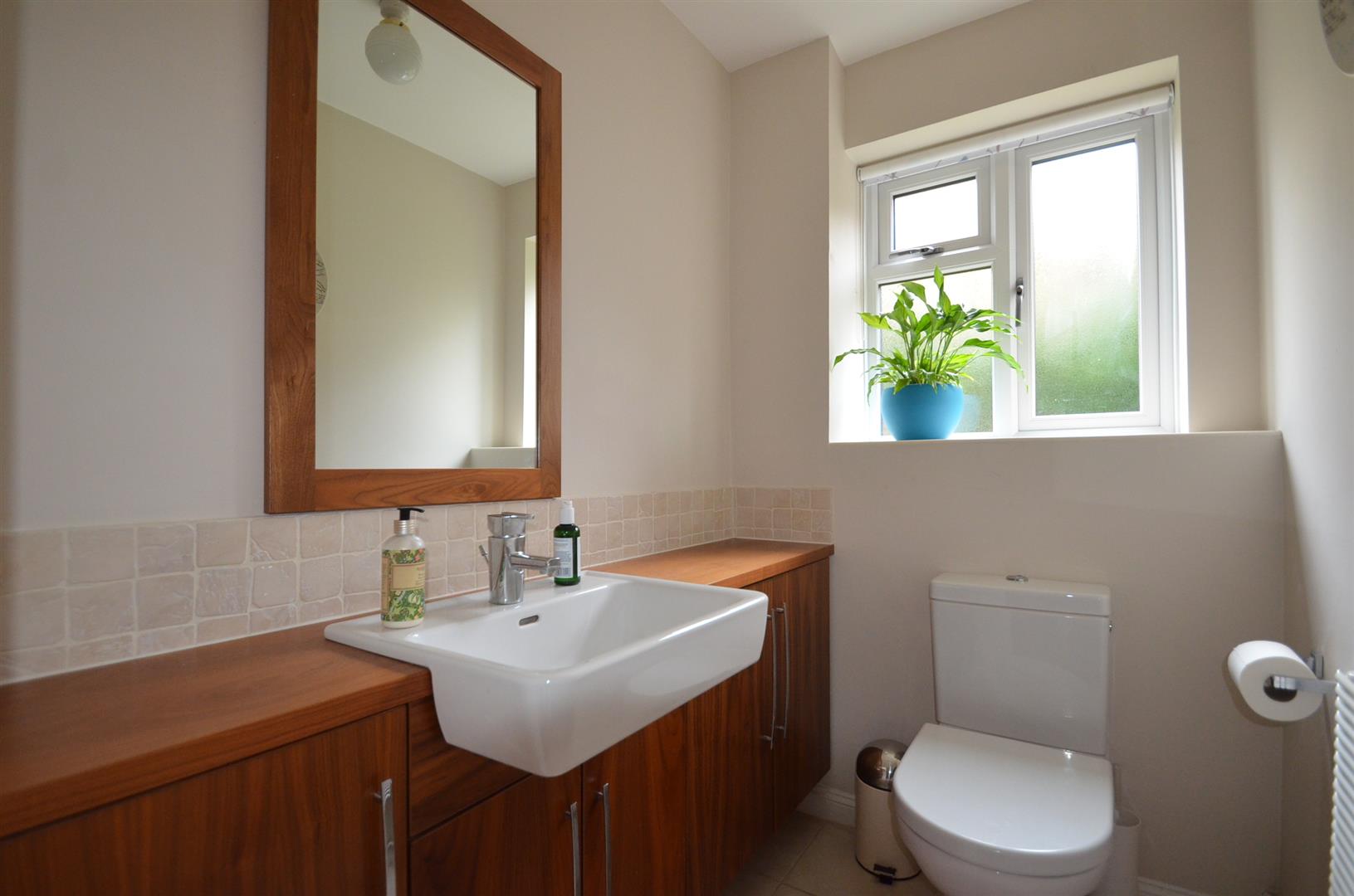 White suite comprising low level w.c, wash hand basin in vanity unit with tiled splashback, heated towel rail, tiled floor, window to side.