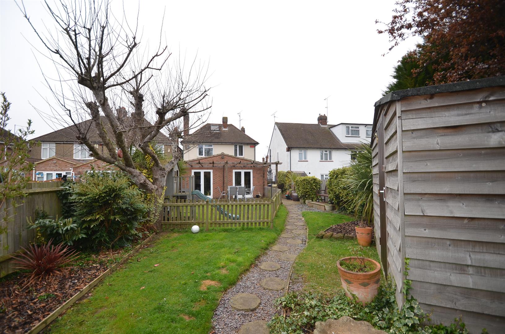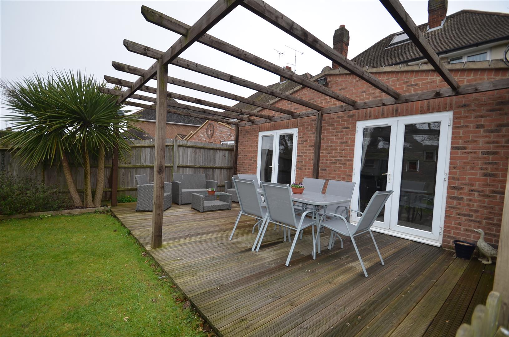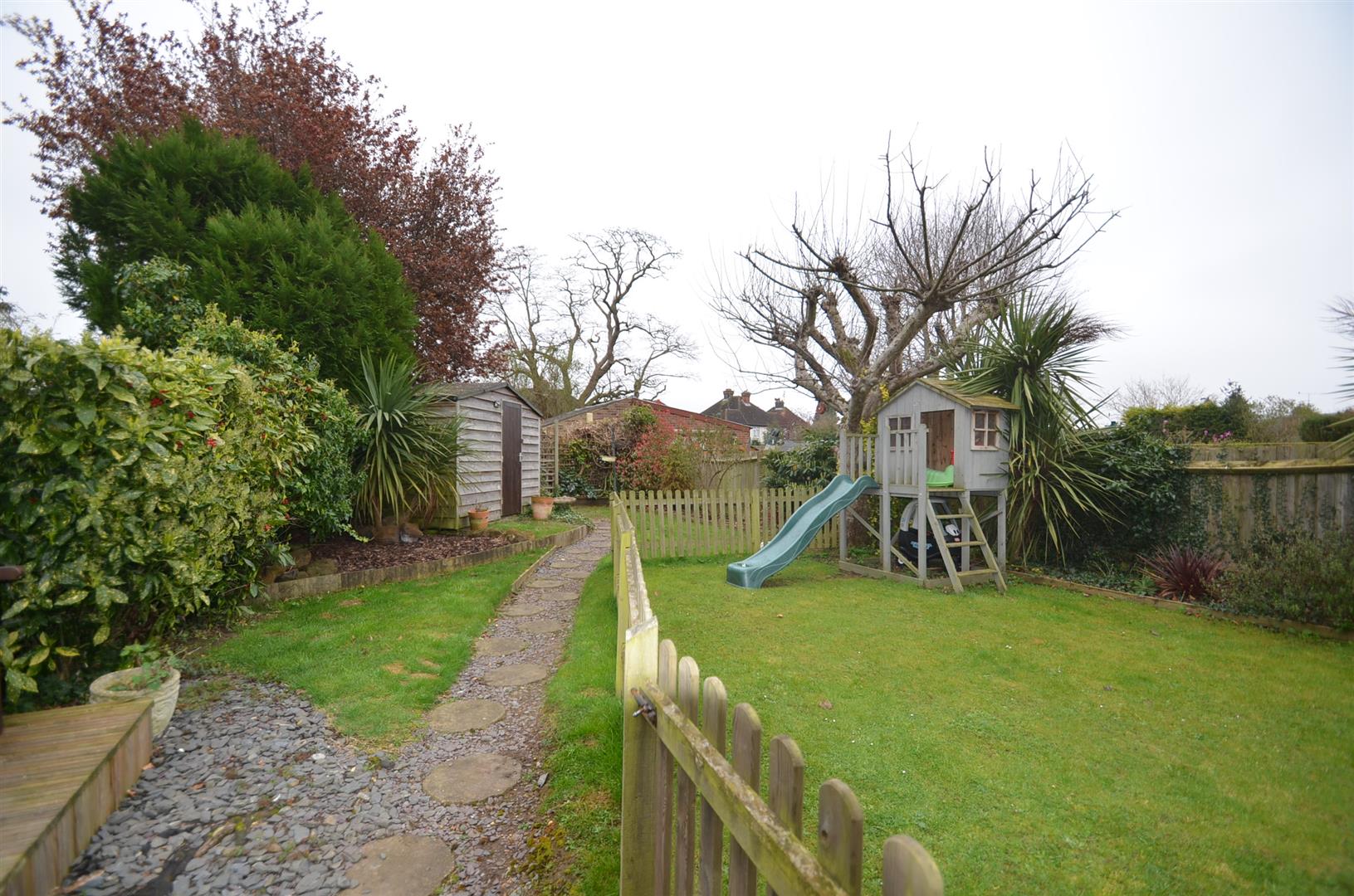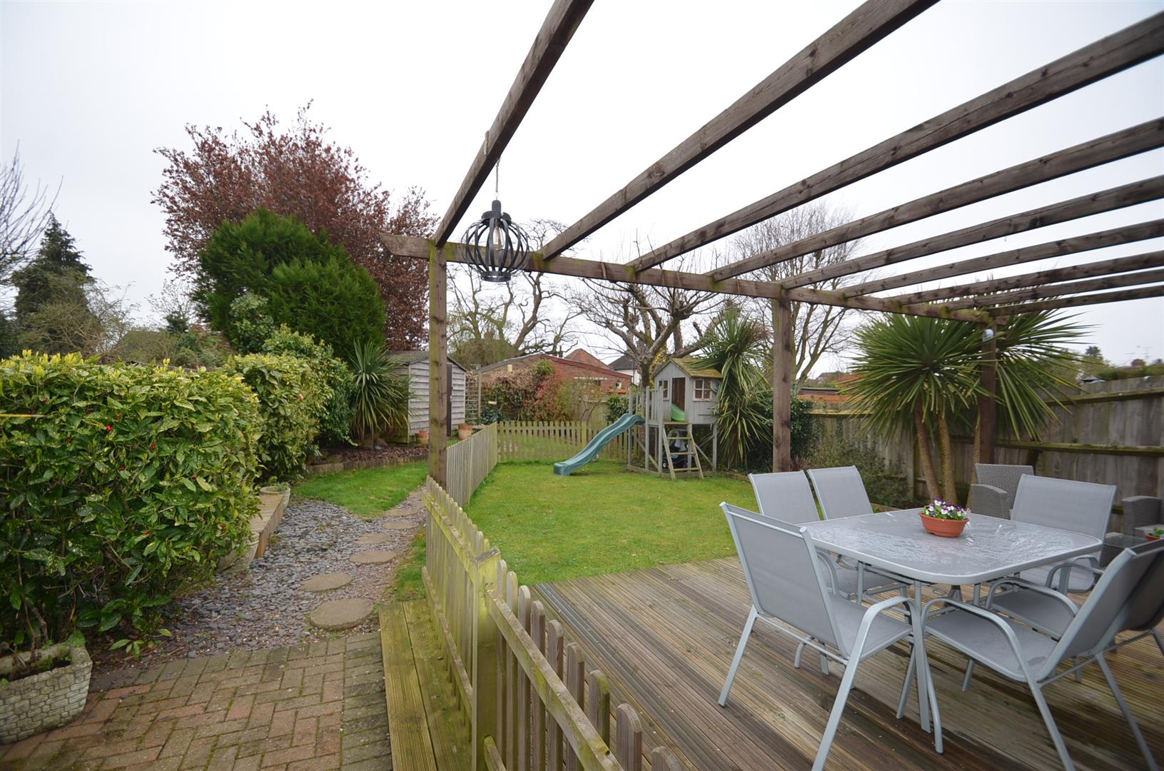 A large, fully enclosed garden with raised decked area with pagoda over, rest laid to lawn with a variety of mature trees and shrubs, large garden shed, gated access to front, access to both double and single garage, gated access to rear.