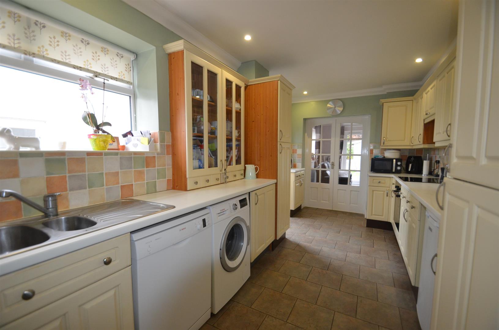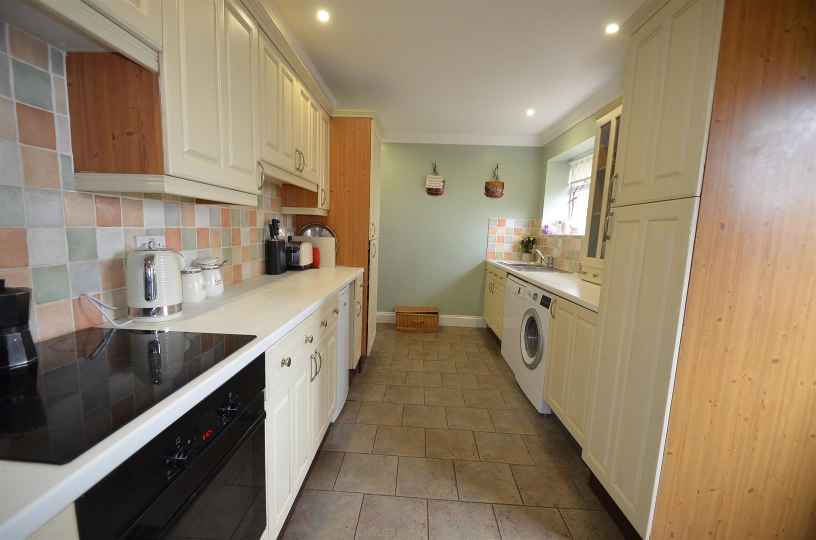Range of base and eye level units with roll top work surfaces, one and a half stainless steel sink unit with mixer tap, tiled splashback, integrated oven with hob over and extractor hood, plumbing for washing machine and dishwasher, window to side, door t