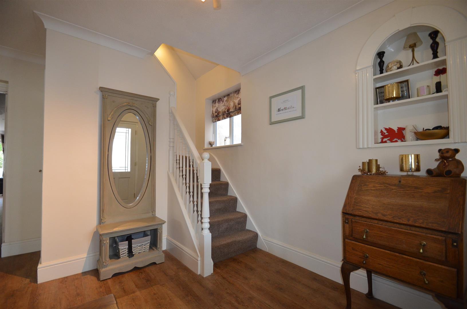 Stairs leading to first floor, radiator, under stairs cupboard, wood effect flooring, window to side.