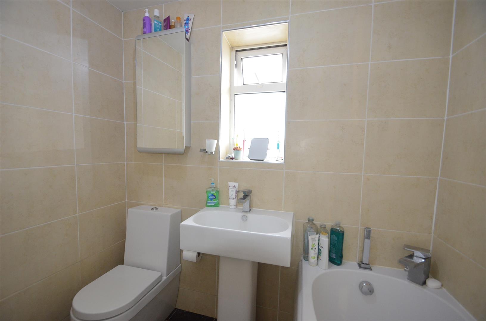 White suite comprising of panel enclosed jacuzzi bath with mixer tap, pedestal wash hand basin, low level w.c, fully tiled walls, window to side, heated towel rail.