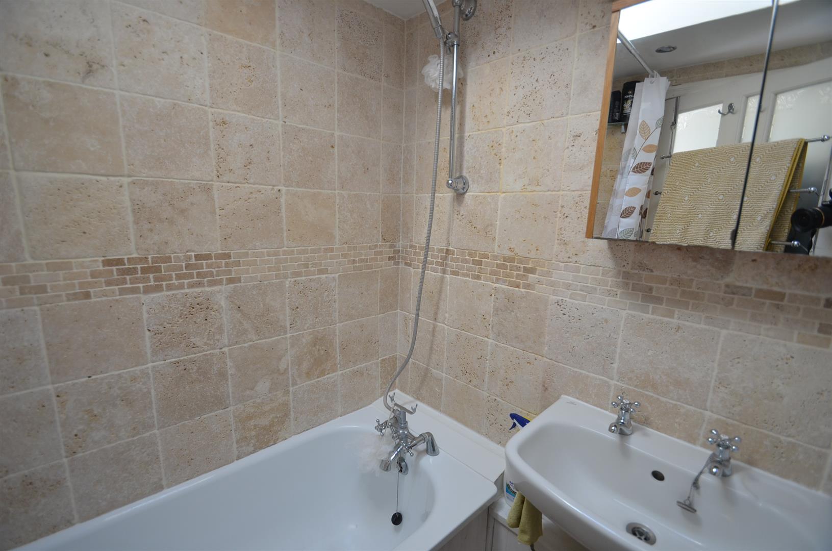 White suite comprising of panel enclosed bath, mixer tap with wall mounted shower attachment, wall mounted wash hand basin, tiled floor, velux window to rear.