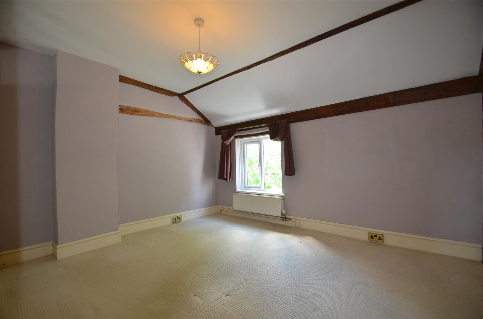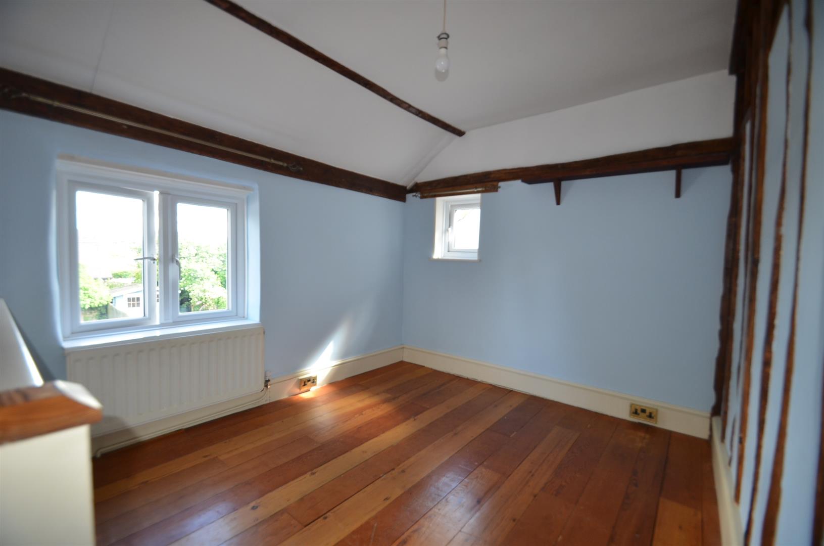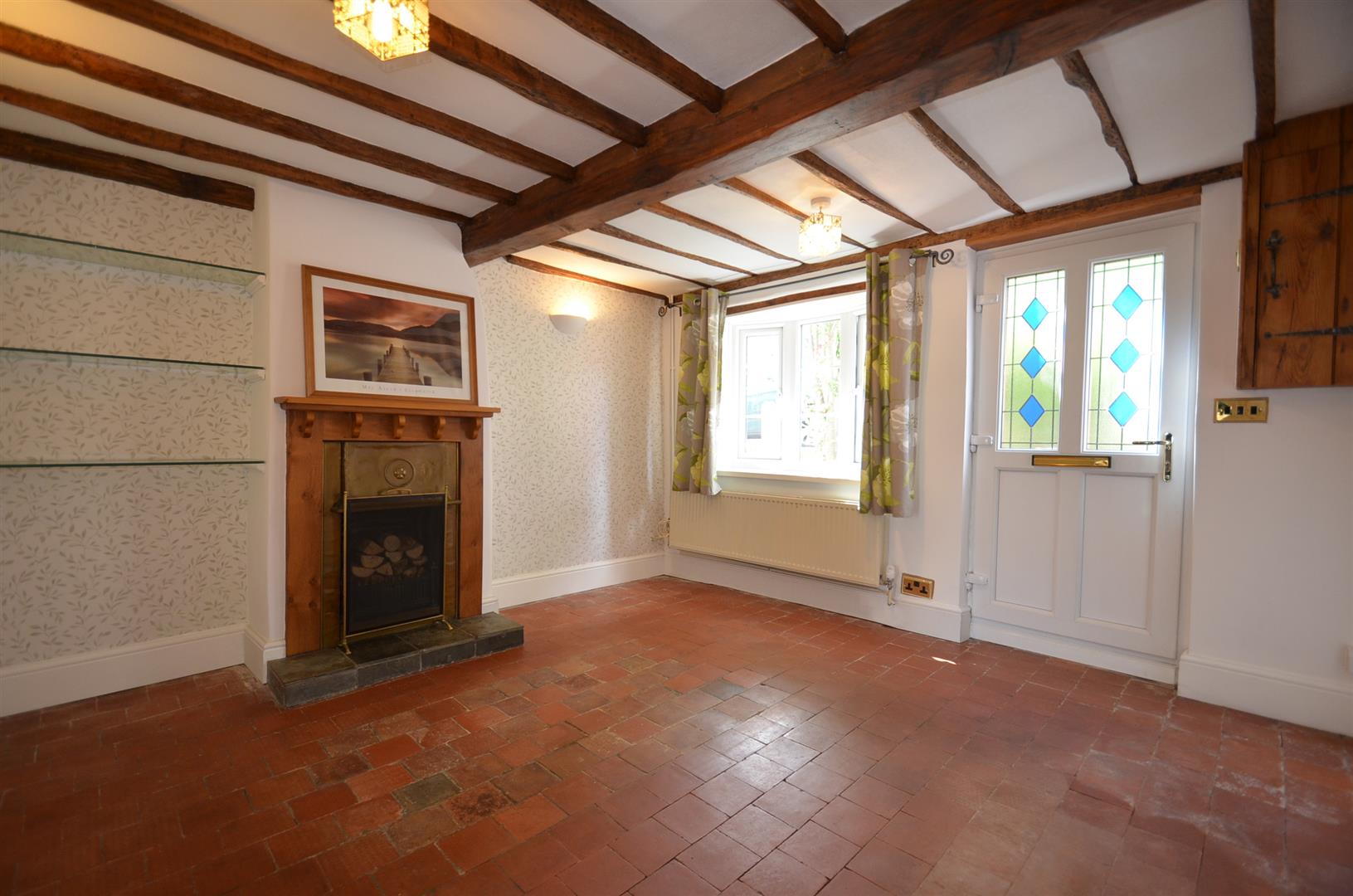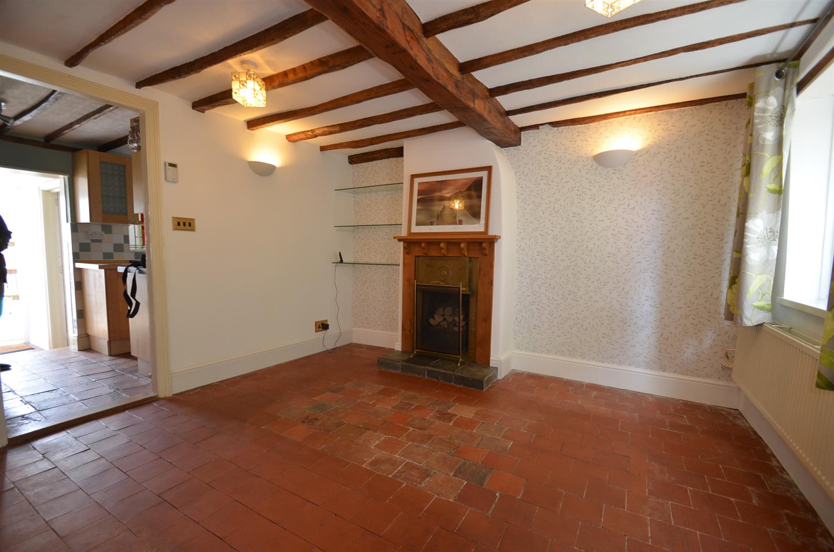 Entrance door, window to front, exposed beams, open fire place with tiled hearth and wooden surround, quarry tiled floor, radiator, cupboard housing electric meter.