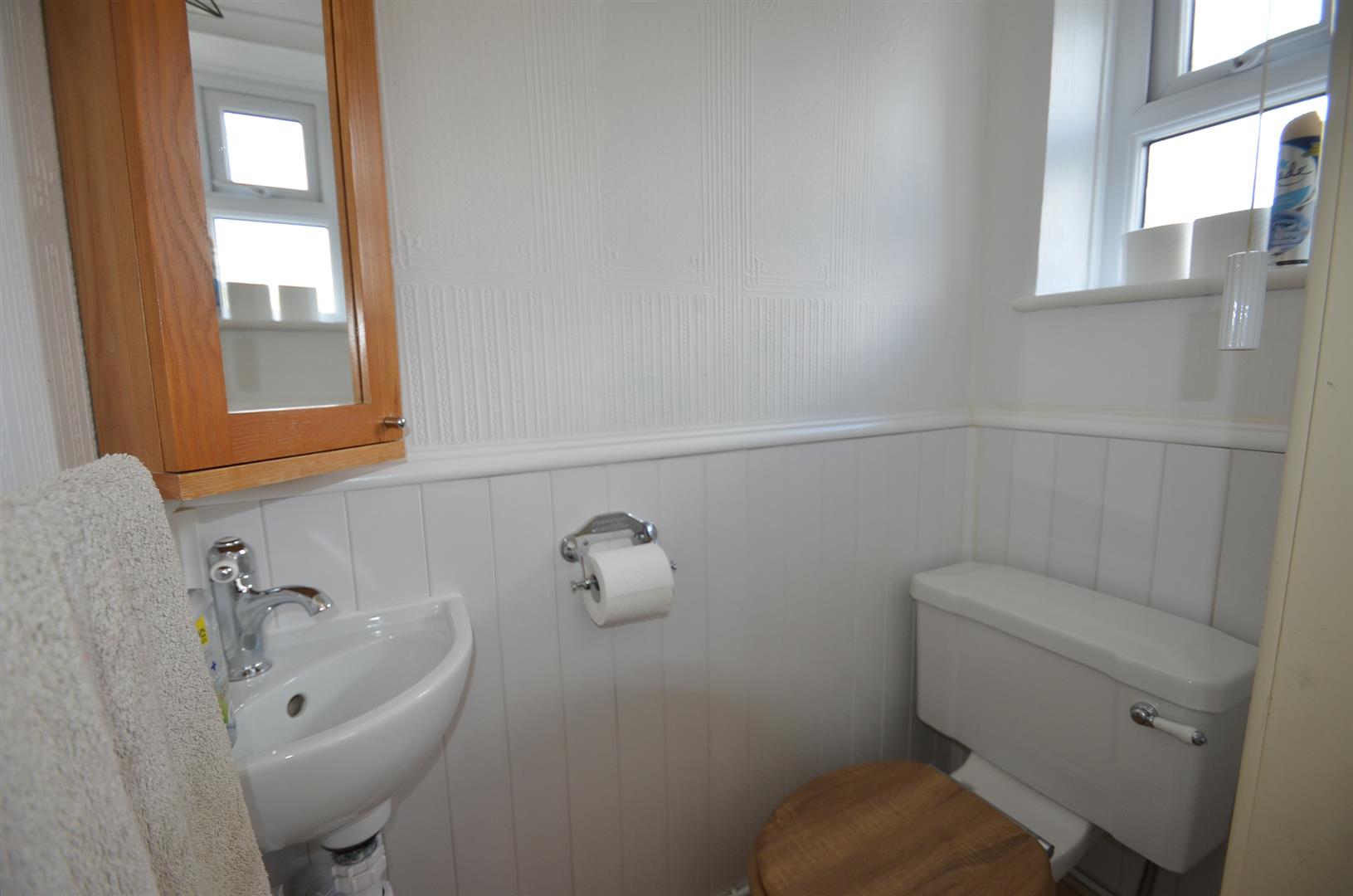 White suite comprising o flow level w.c, wall mounted basin, tiled floor, window to rear.
