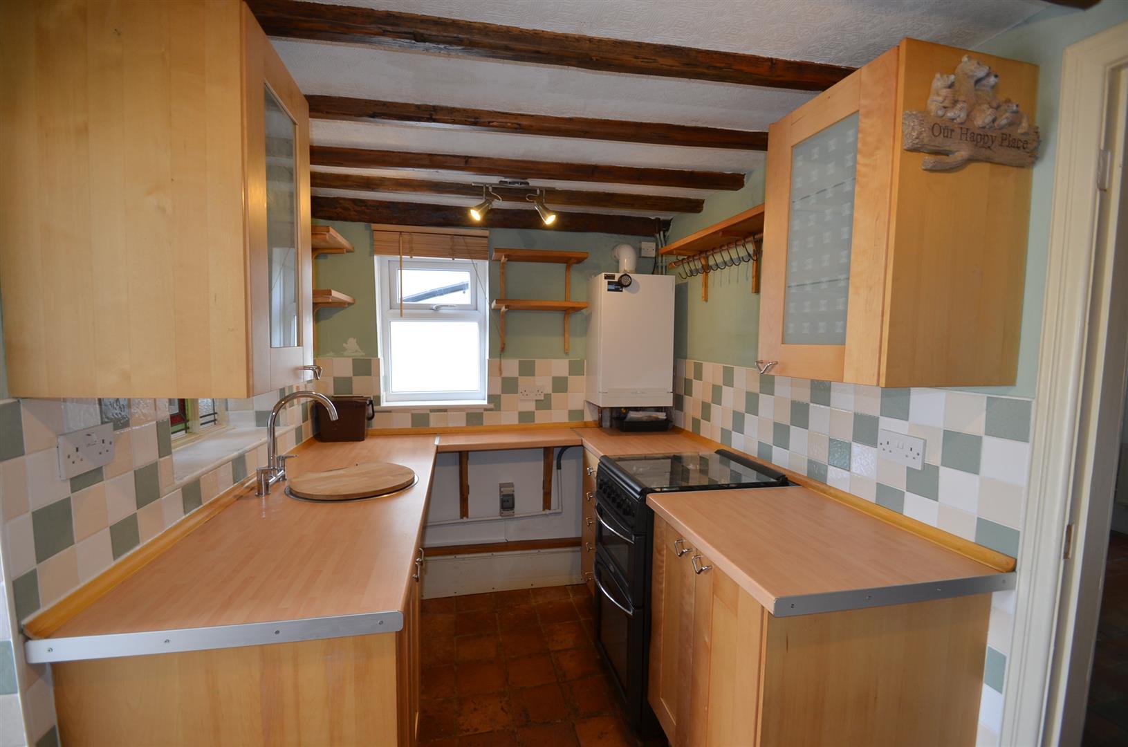 Fitted kitchen with a range of base and eye level units with roll top work surfaces, inset sink unit with mixer tap, tiled splash back, tiled floor, wall mounted gas boiler, stairs leading to first floor, exposed beams, window to side.