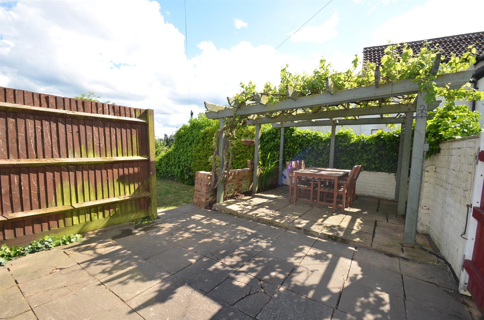 Paved patio area, gated access to front, large pergola with paved patio beneath, steps down onto lawn with summer house at rear of garden.