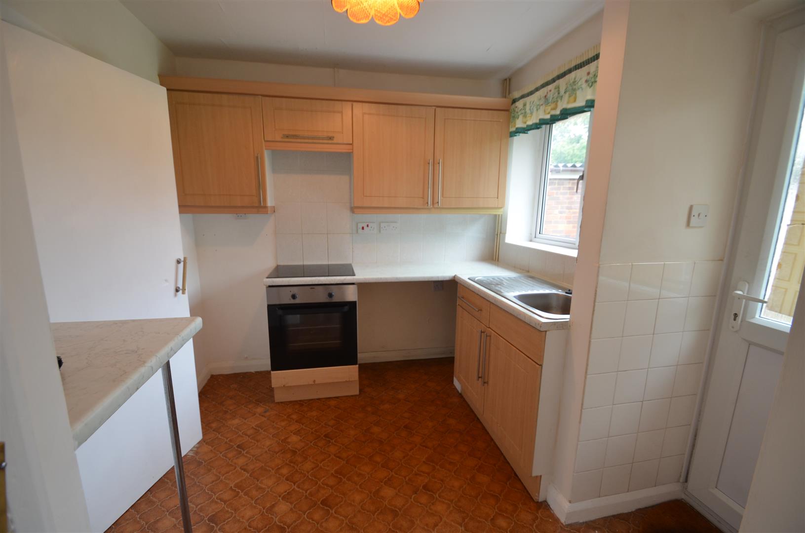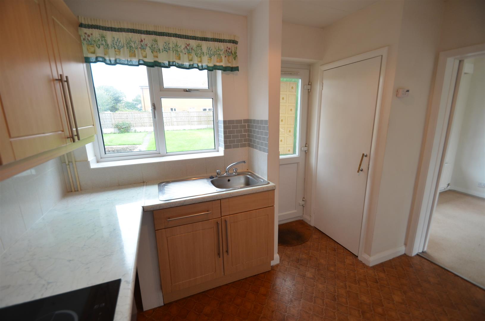 Range of base and eye level units with roll top work surfaces, stainless steel sink unit, wall mounted boiler, window to rear, door to garden.
