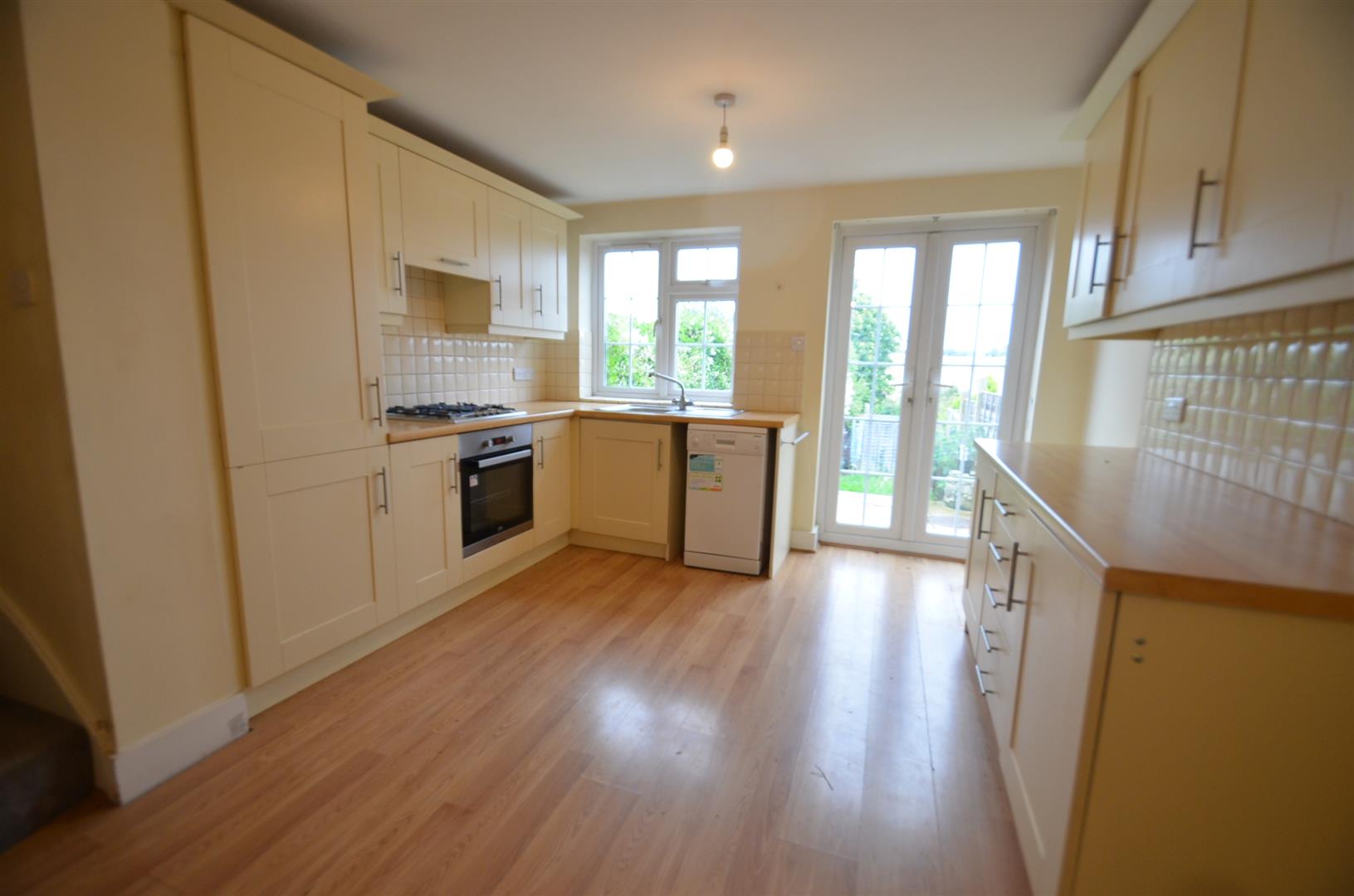 Range of base and eye level units with roll top work surfaces, stainless steel sink unit with mixer tap, integrated oven and hob, integrated fridge/freezer, plumbing for dishwasher, window to rear, French doors to garden.